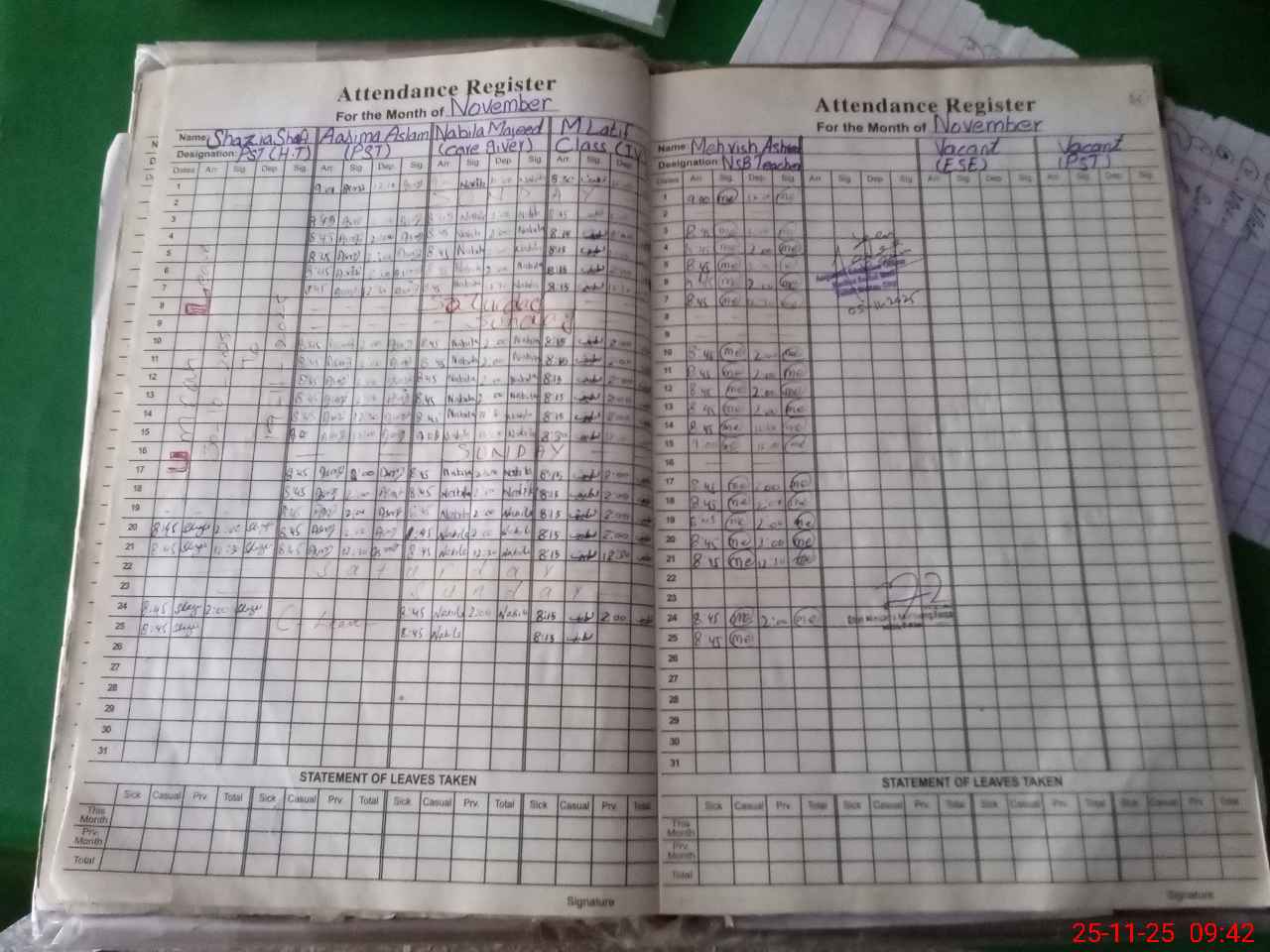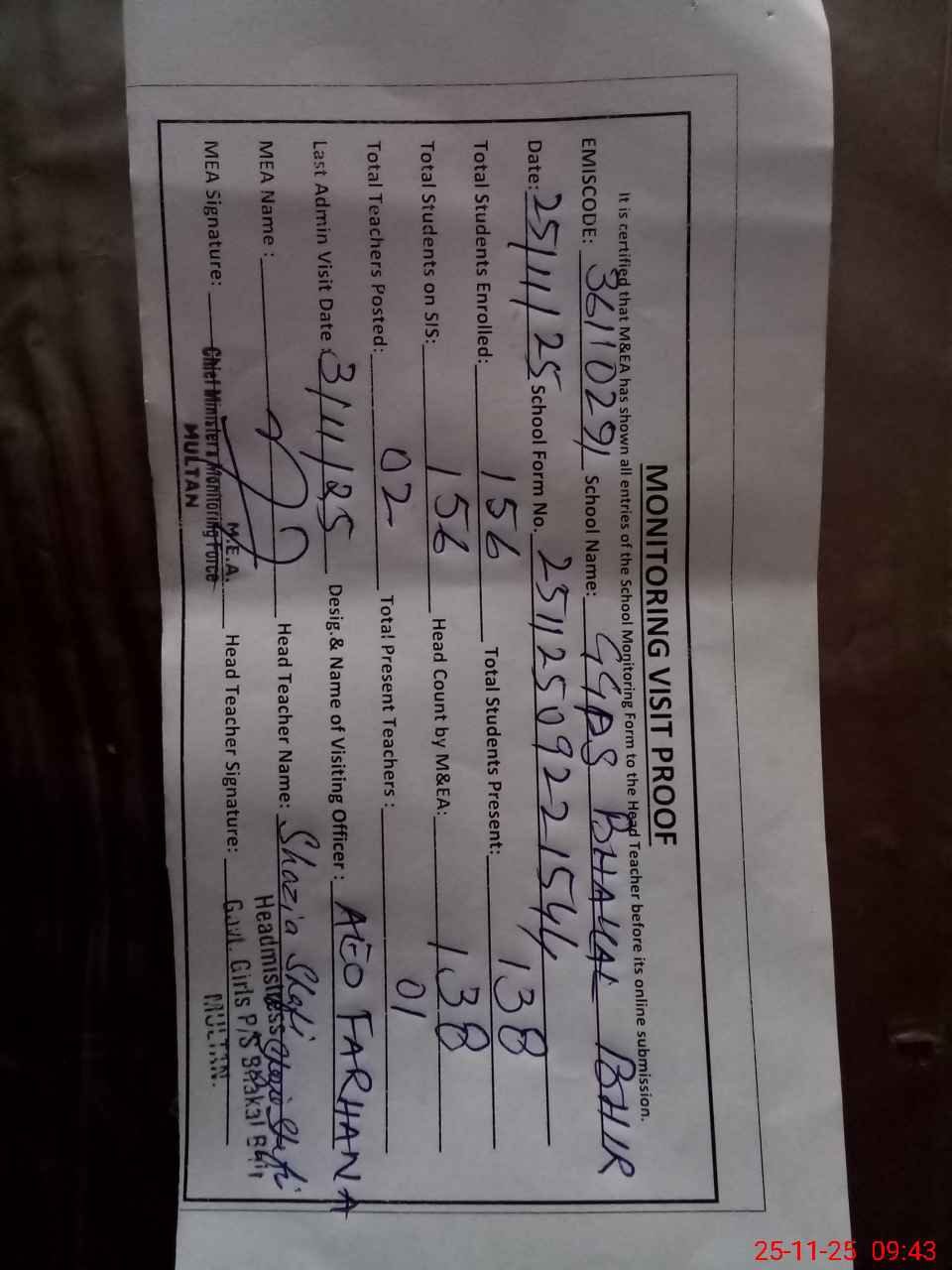 | Attendance Register | Head Teacher | MEA with School | Visit Proof |