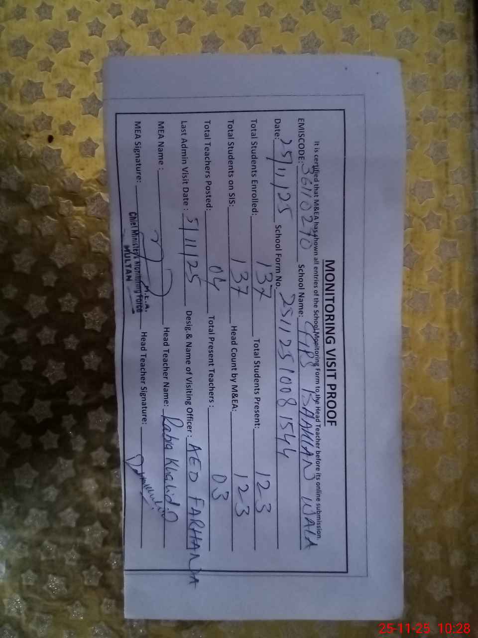 | Name: Fa**** Designation: (School Headmaster's/Headmistress's) H M Phone/Cell Number: 03**** |