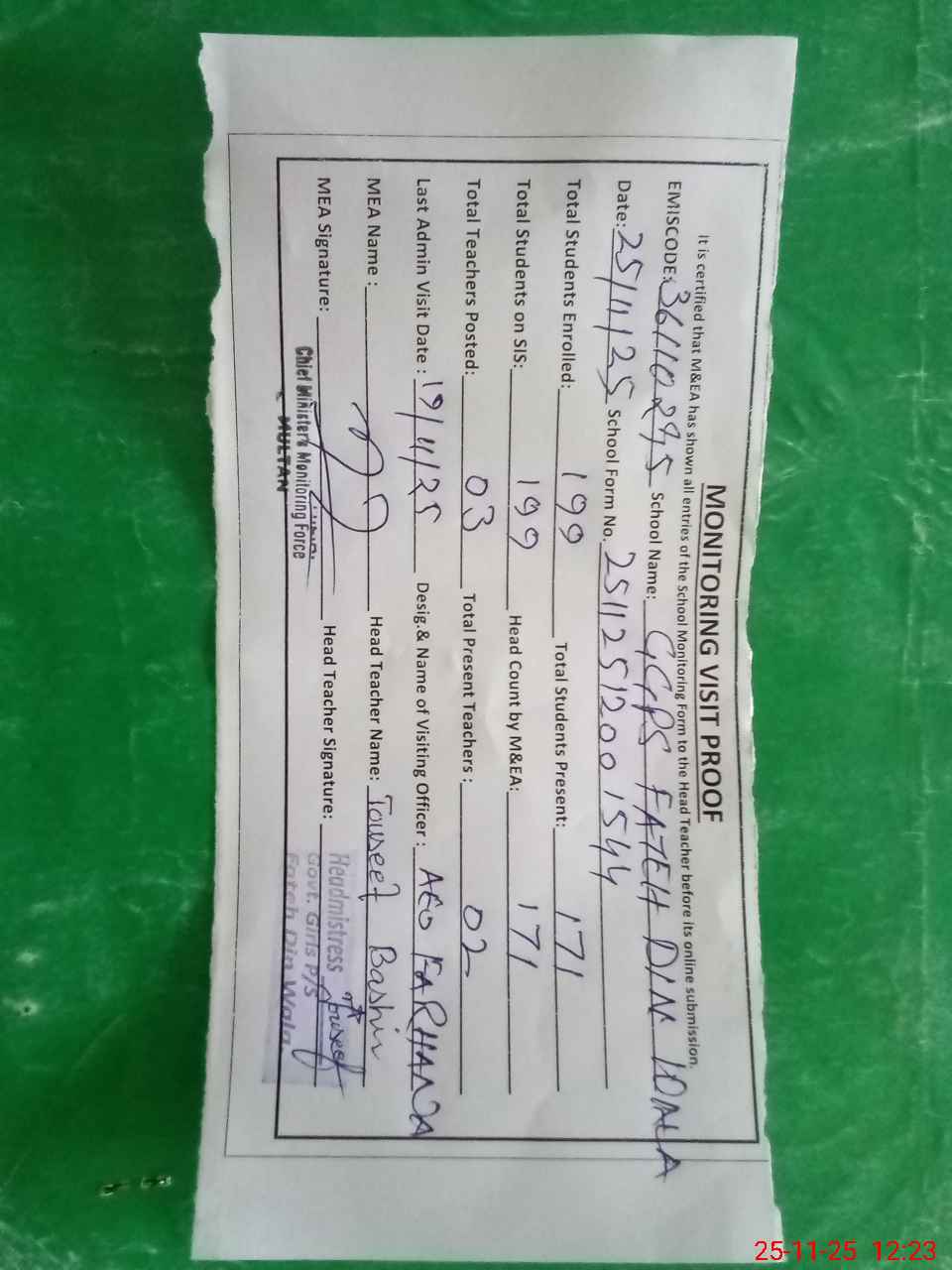 | Attendance Register | Head Teacher | MEA with School | Visit Proof |