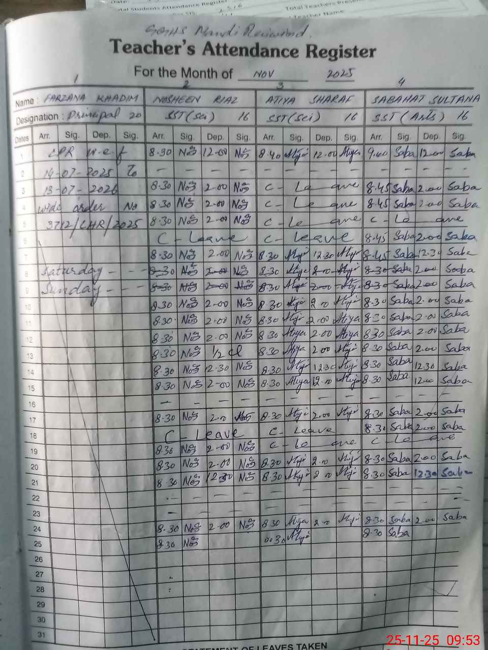 | Remarks (Use Separate Page if Required): 1 Narjis Batool PST on earned leave as per register but leave still waiting for approval so as per SOP marked her absent 2 This school comprises of three campus at different location serving different classes 3 AEO Samreen conducted last visit on 11 Nov 2025 | |||||