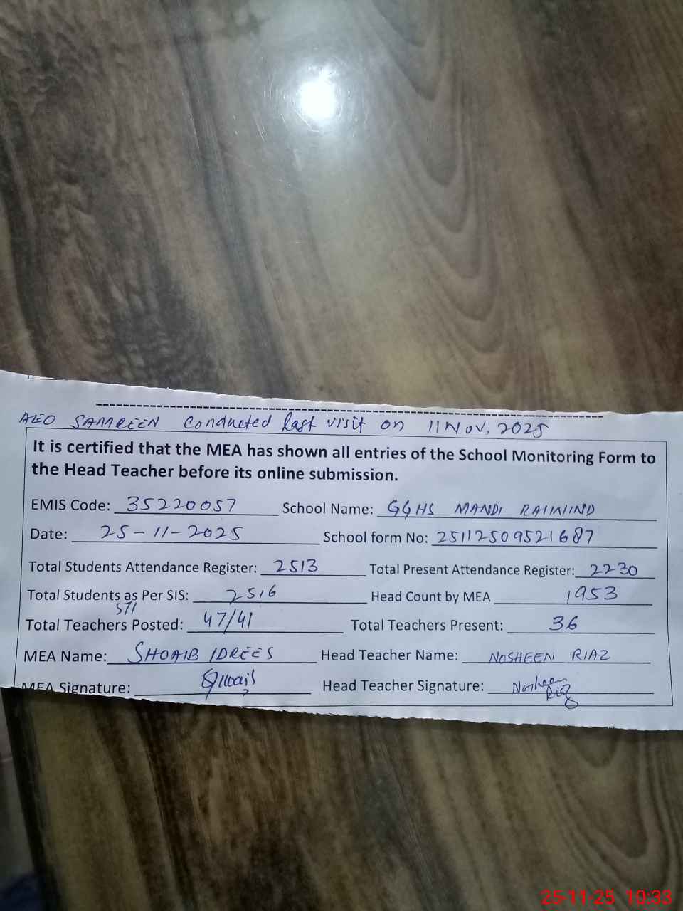 | EMIS Code: 35220057 | Name of School: GGHS MANDI RAIWIND | |||