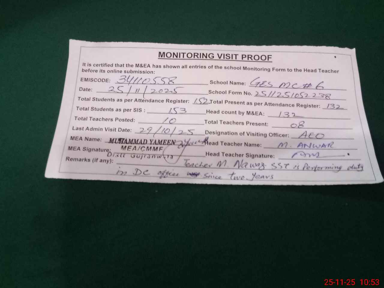 | Attendance Register | Head Teacher | MEA with School | Visit Proof |