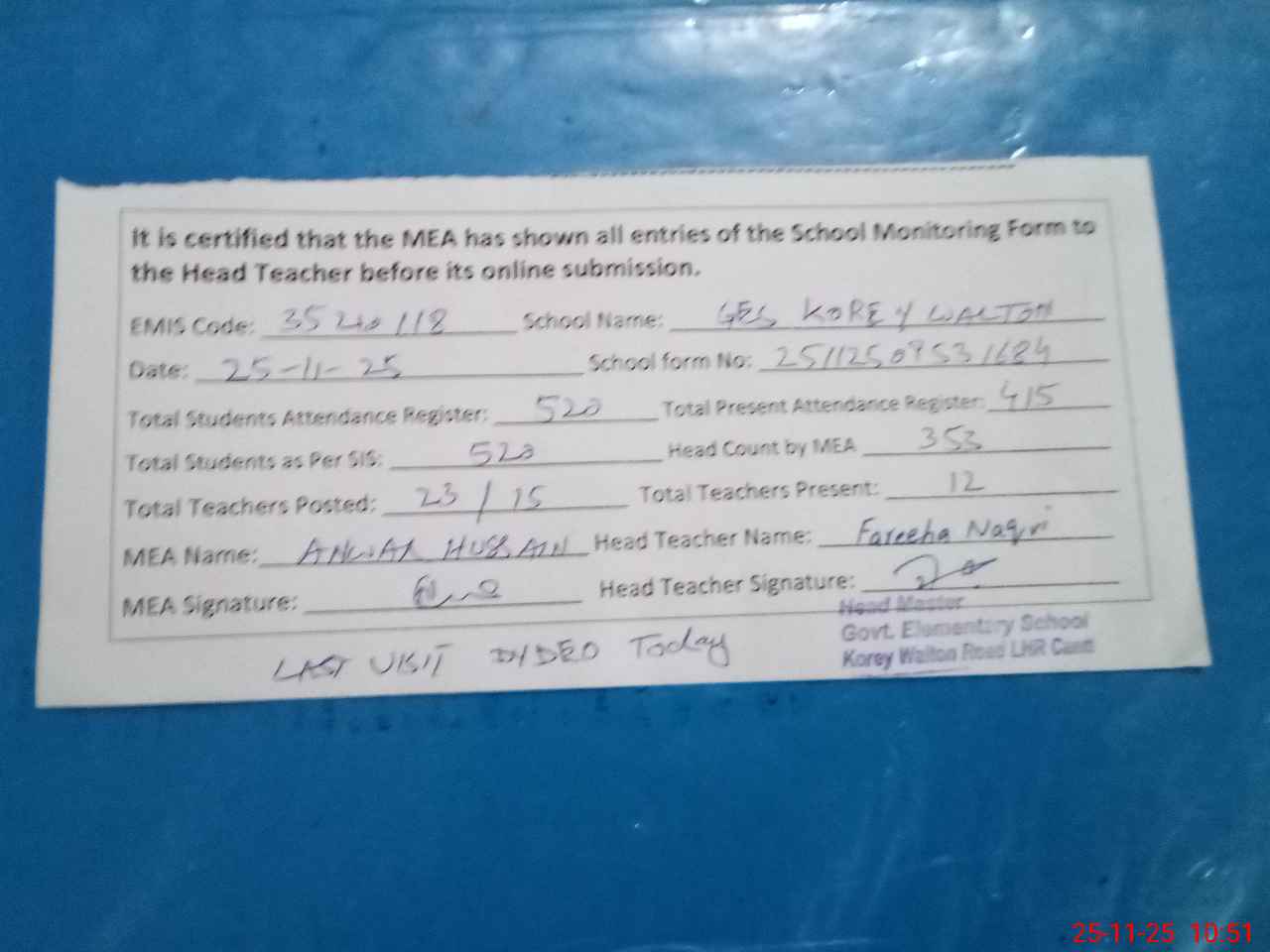 | Attendance Register | Head Teacher | MEA with School | Visit Proof |