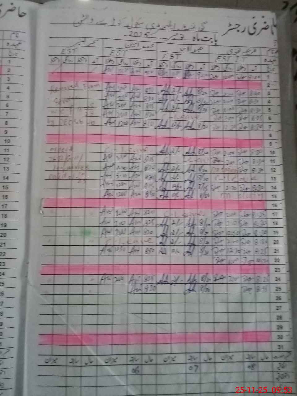 | CNIC | Full Name | Designation | R/C | Absence During Last Calender Month |