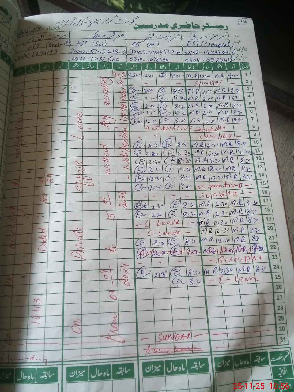 | CNIC | Full Name | Designation | R/C | Absence During Last Calender Month |