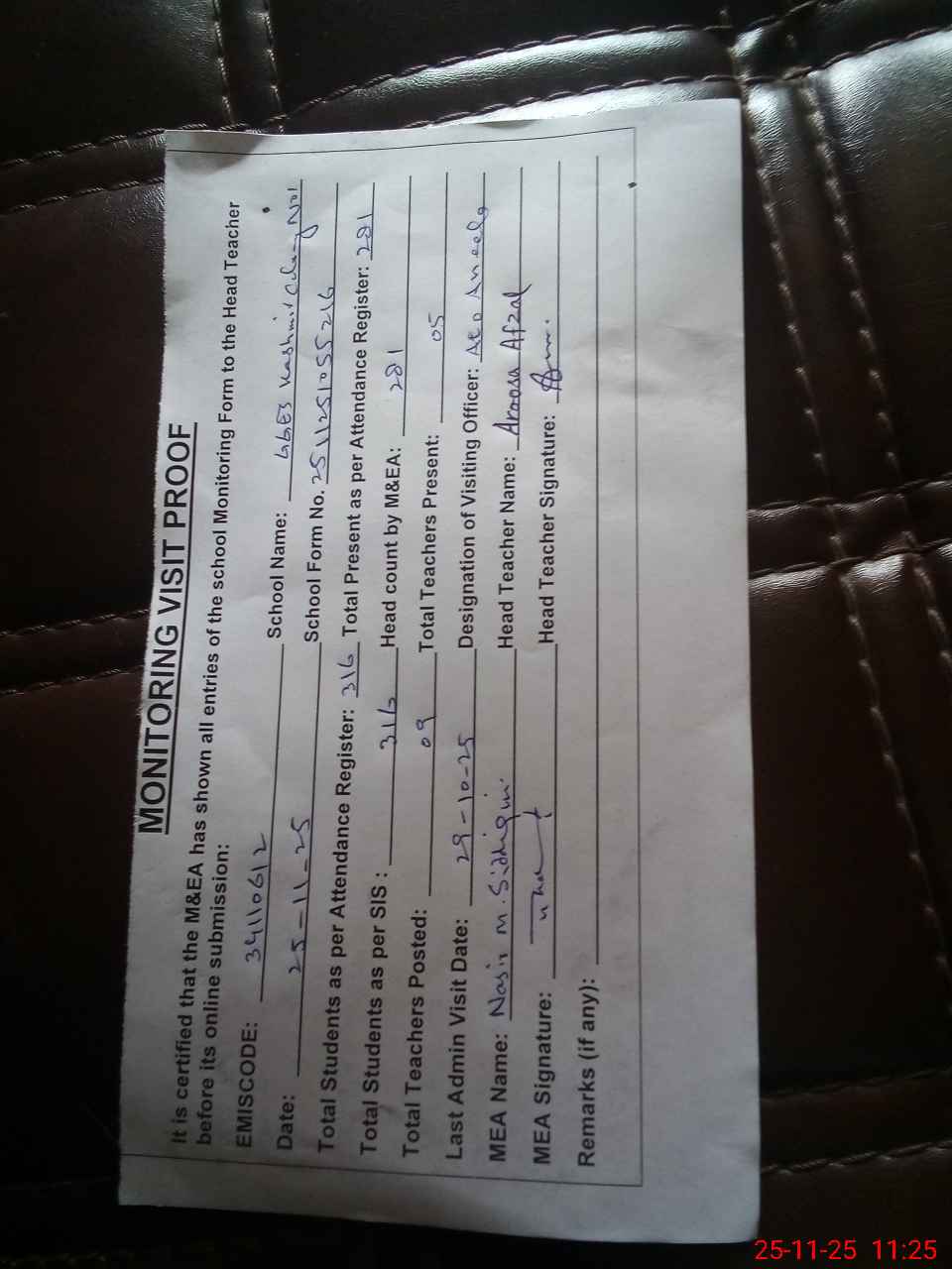 | Attendance Register | Head Teacher | MEA with School | Visit Proof |