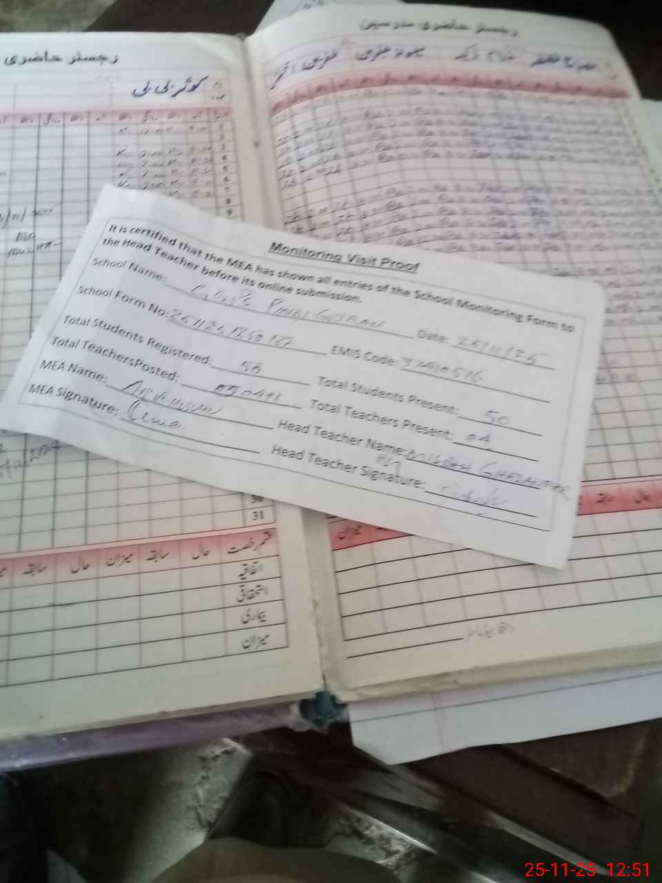 | Attendance Register | Head Teacher | MEA with School | Visit Proof |