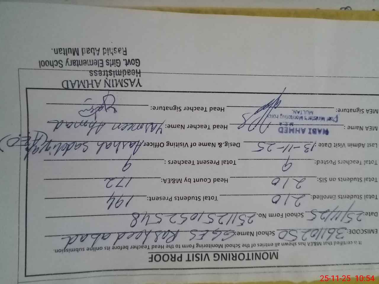 | Certified that this School was Inspected by the Undersigned MEA/DMO Today and the Information Stated Above is as Per Record. | |||||
