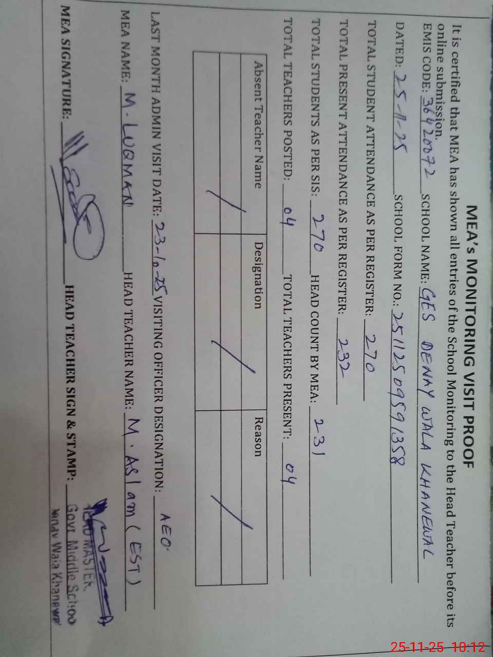 | Attendance Register | Head Teacher | MEA with School | Visit Proof |