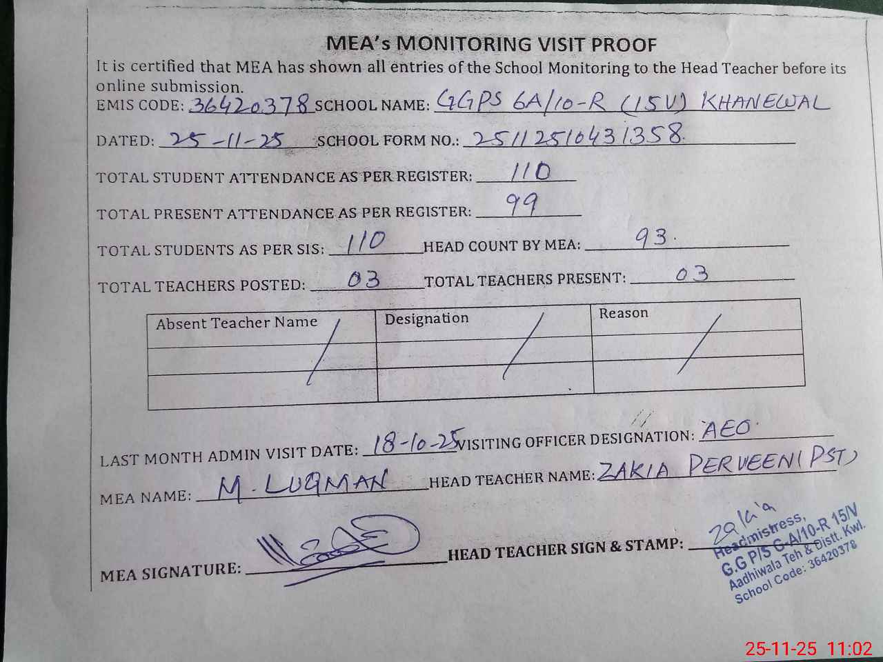 | Attendance Register | Head Teacher | MEA with School | Visit Proof |