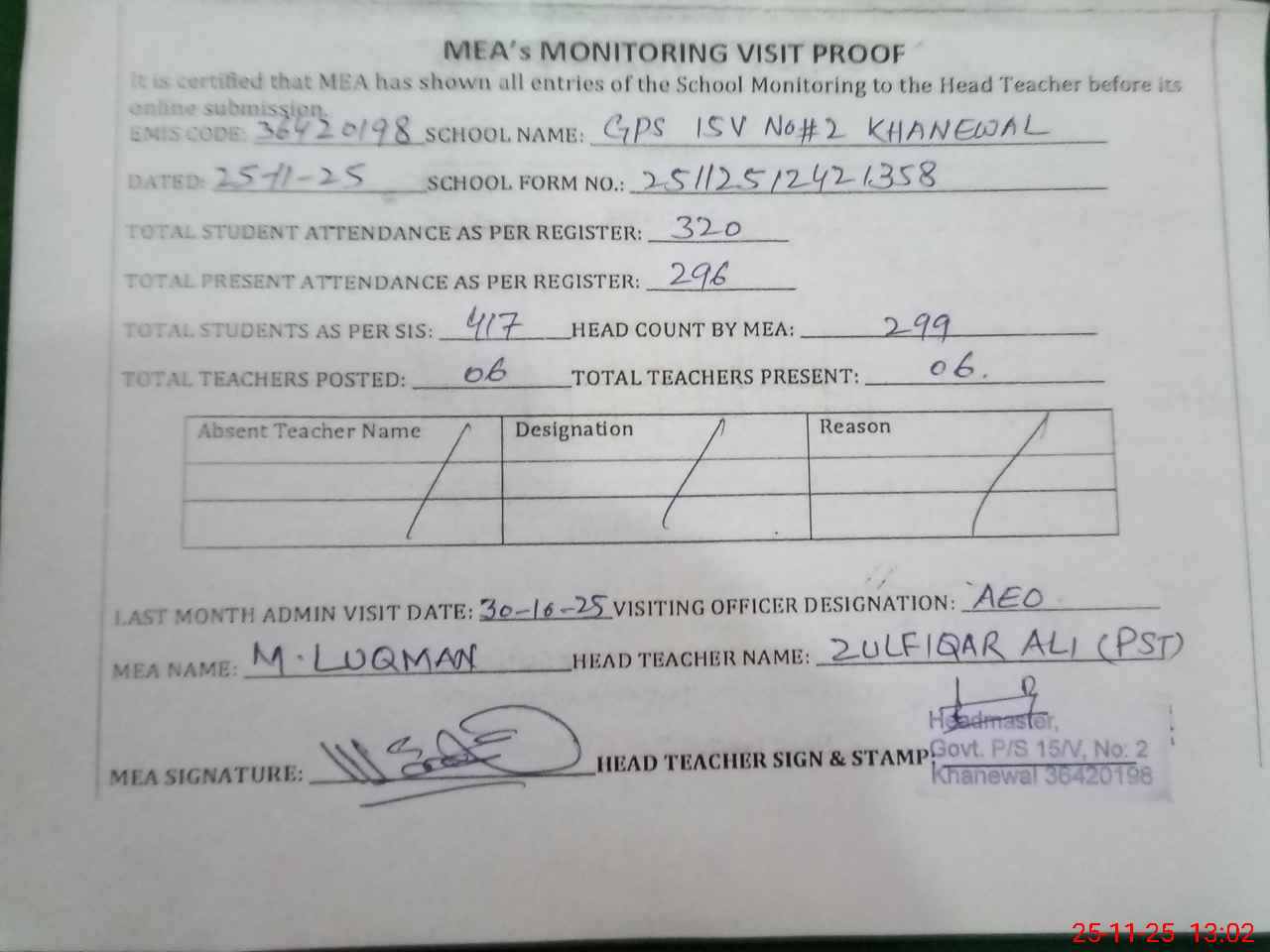 | Attendance Register | Head Teacher | MEA with School | Visit Proof |
