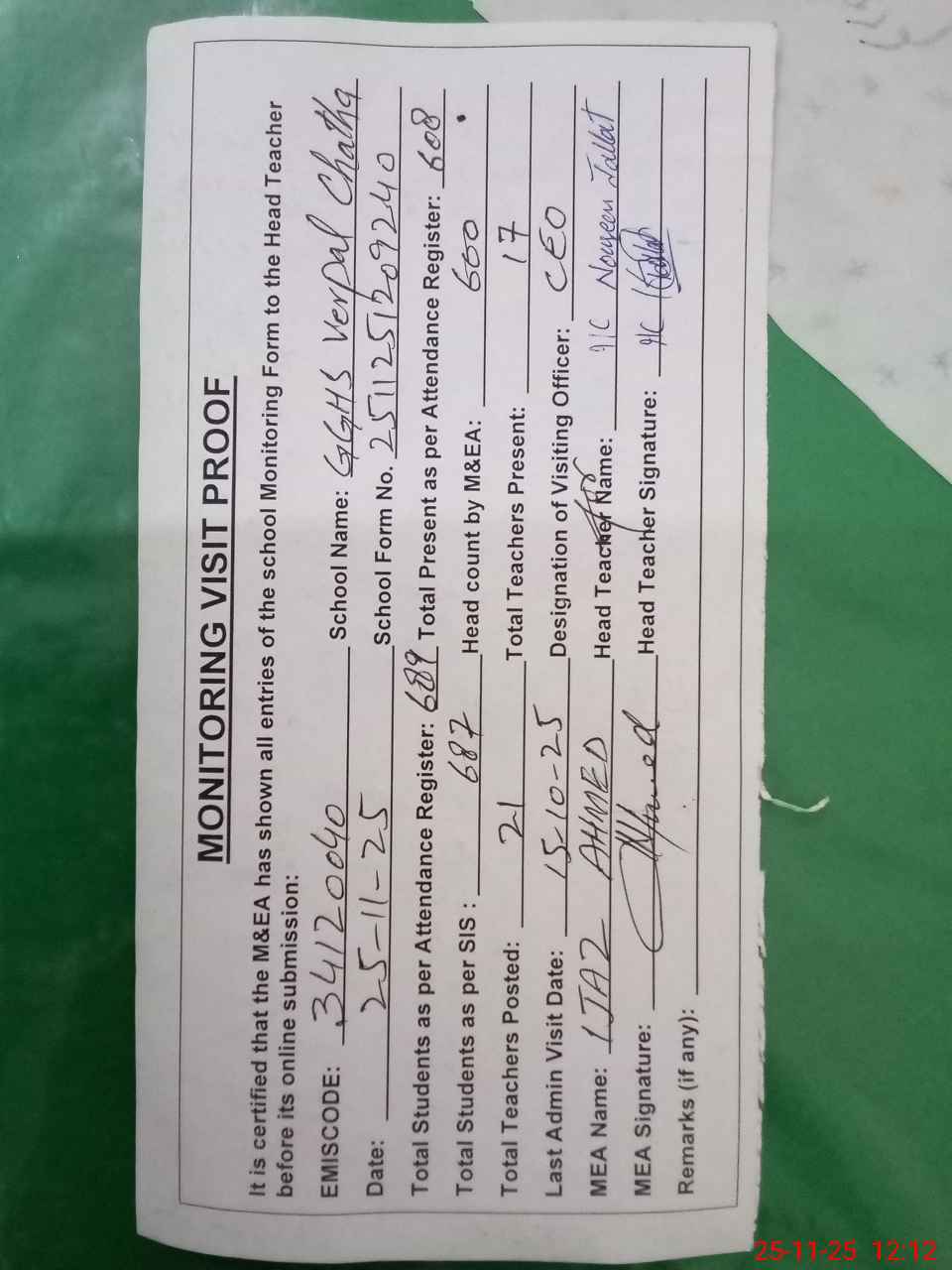 | Attendance Register | Head Teacher | MEA with School | Visit Proof |