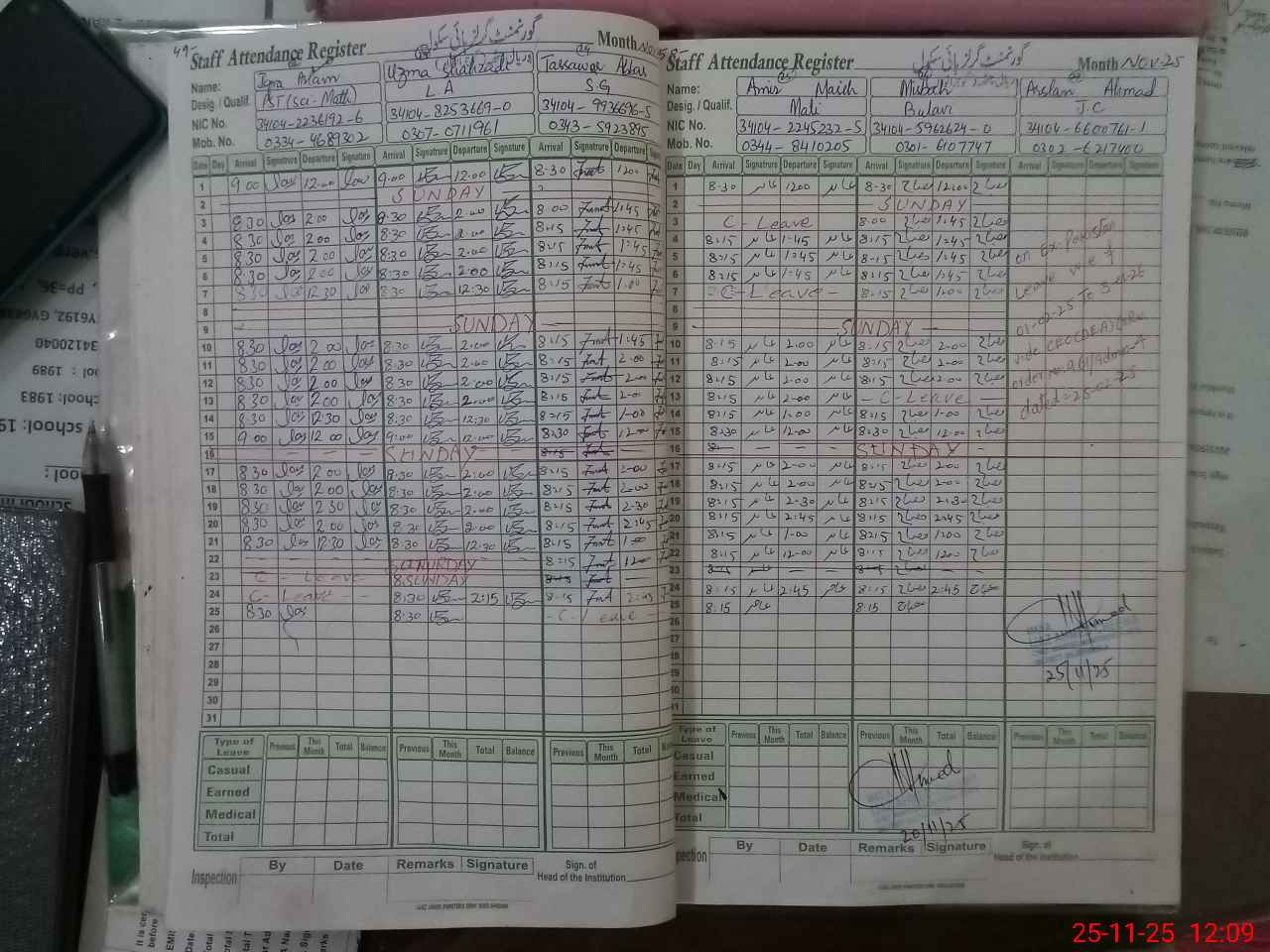 | Remarks (Use Separate Page if Required): 1. Teacher Saba Shoaib PST has applied Ex Pak leave from 19 April 2025 to 31 January 2026 but her leave still not approved by competent authority. 2. Teacher Amna Zafar PST has applied Maternity Leave from 16 Sep 25 to 14 Dec 25 but her leave still not approved by competent authority. | |||||