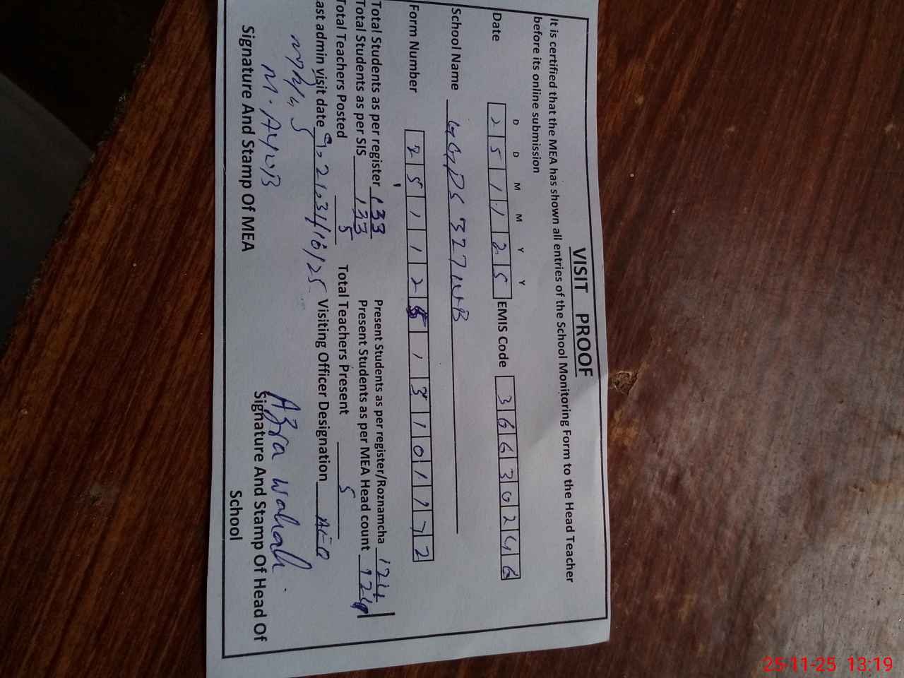 | Attendance Register | Head Teacher | MEA with School | Visit Proof |
