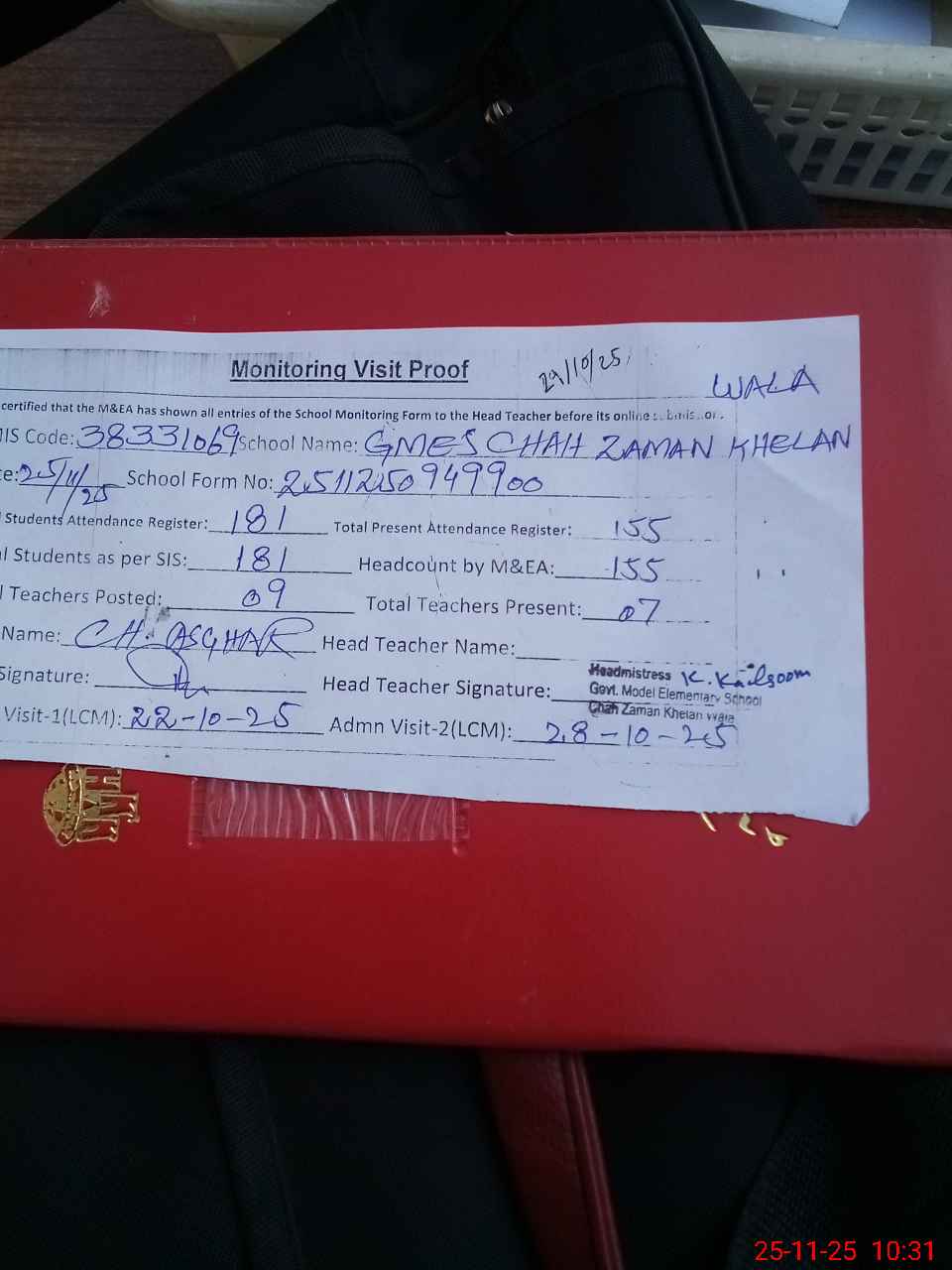 | Attendance Register | Head Teacher | MEA with School | Visit Proof |