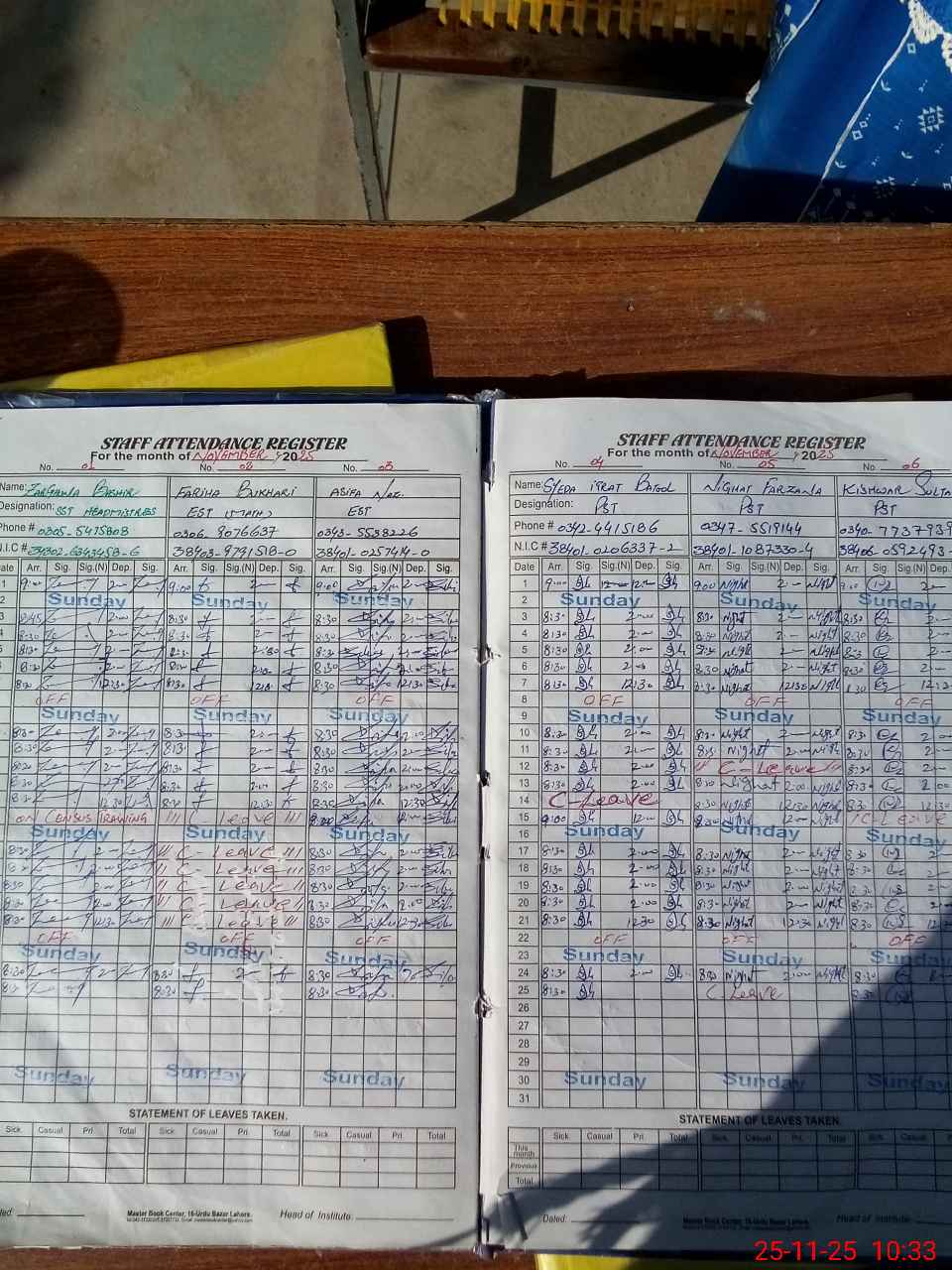 | CNIC | Full Name | Designation | R/C | Absence During Last Calender Month |