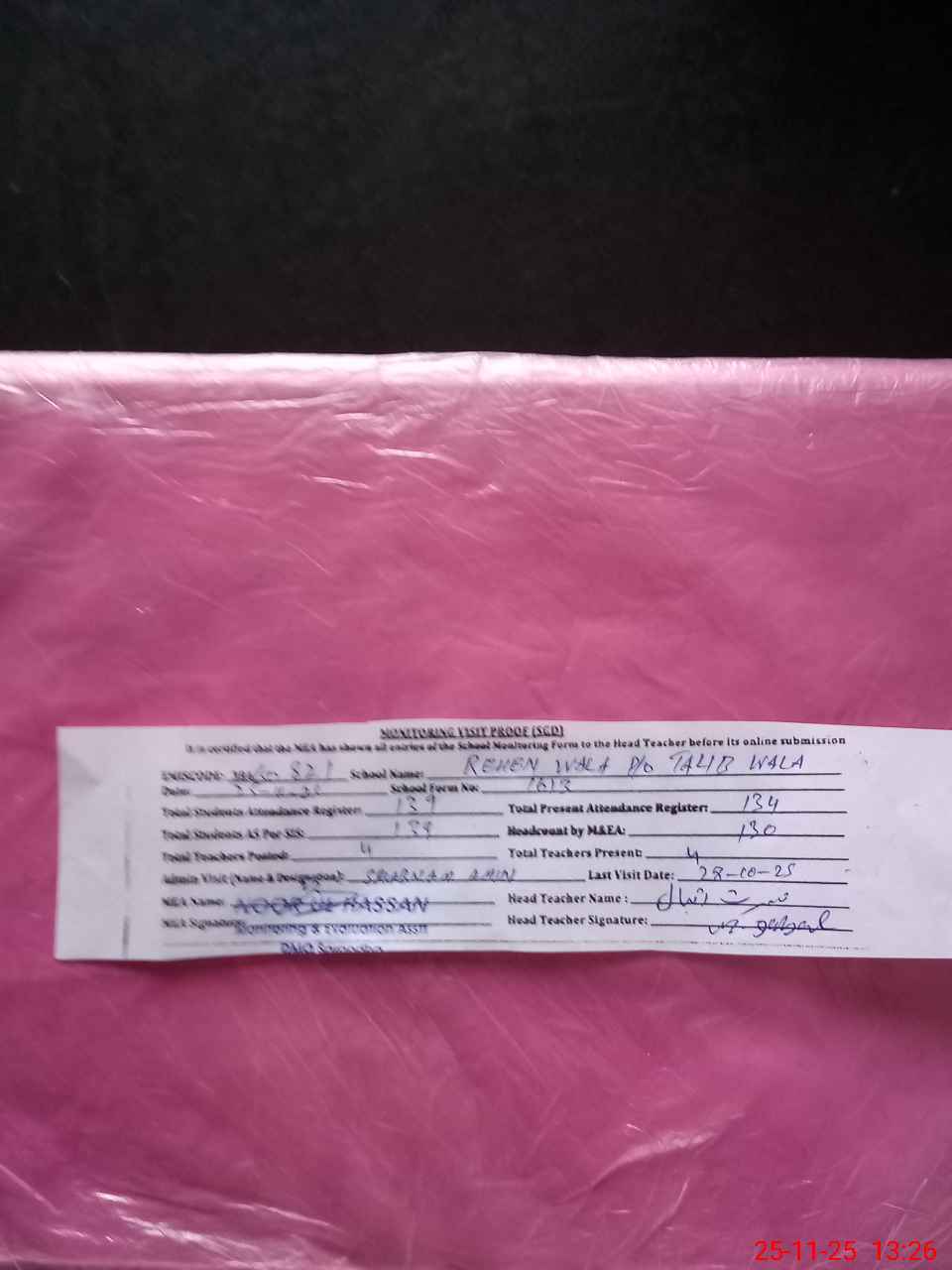 | Attendance Register | Head Teacher | MEA with School | Visit Proof |