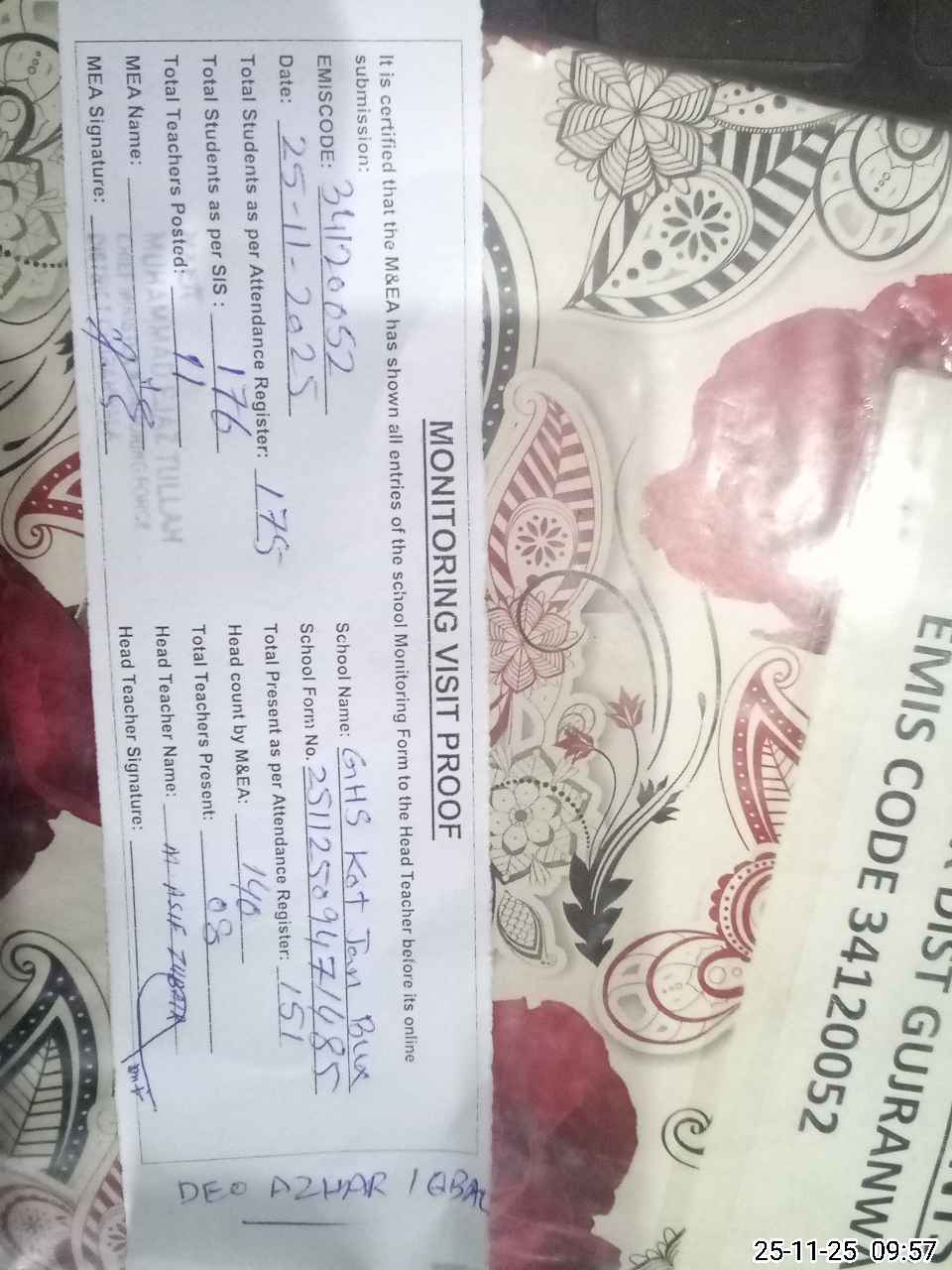 | Attendance Register | Head Teacher | MEA with School | Visit Proof |