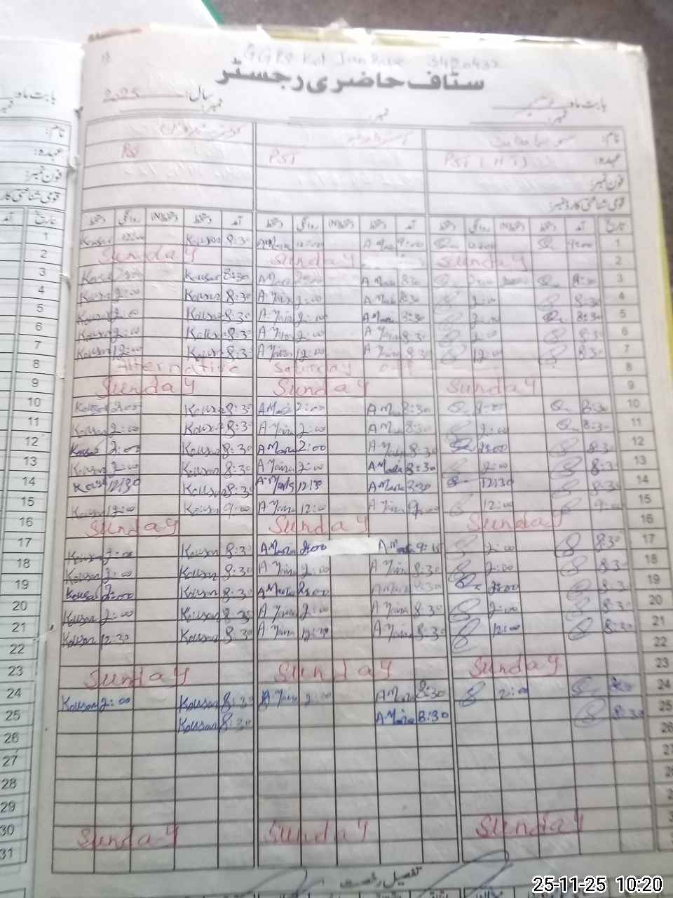 | CNIC | Full Name | Designation | R/C | Absence During Last Calender Month |