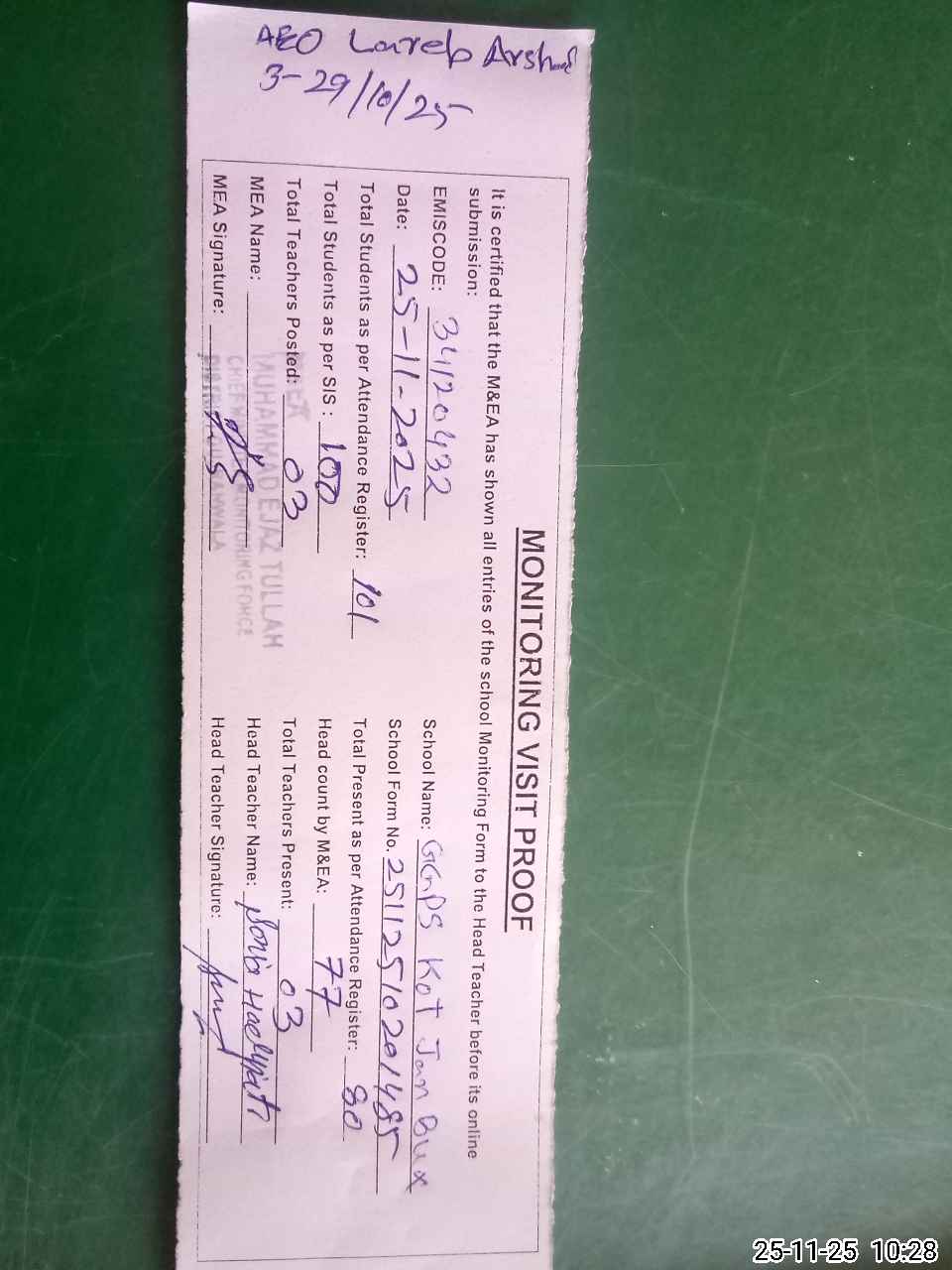 | Attendance Register | Head Teacher | MEA with School | Visit Proof |