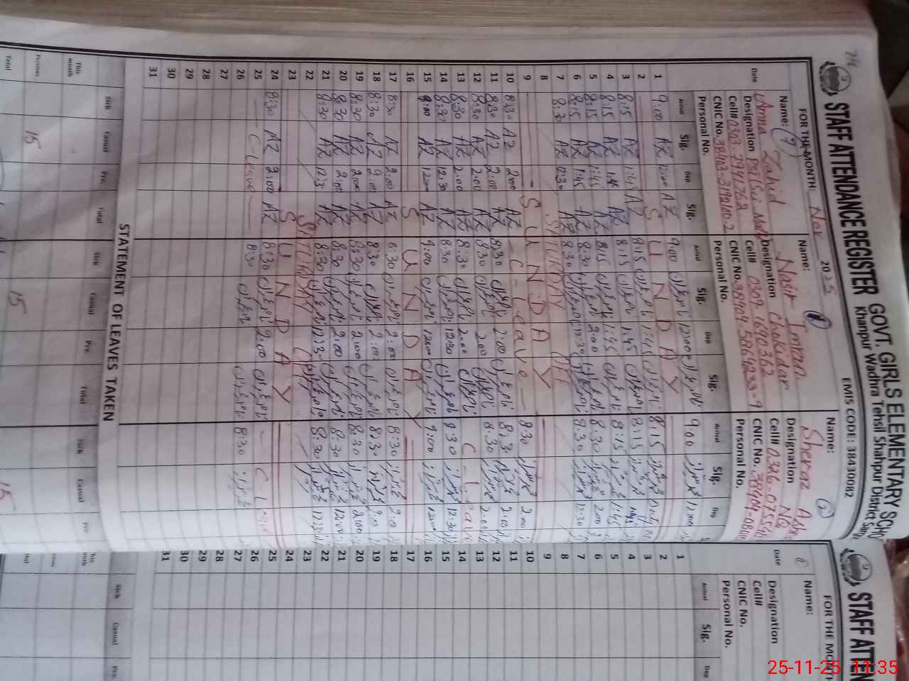 | CNIC | Full Name | Designation | R/C | Absence During Last Calender Month |