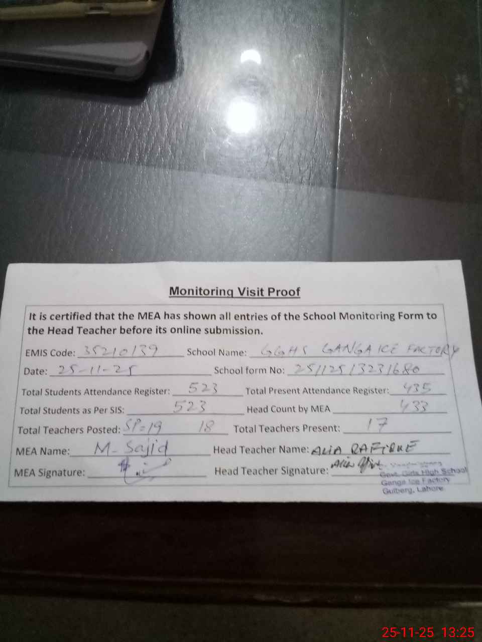 | EMIS Code: 35210139 | Name of School: GGHS GANGA ICE FACTORY GULBERG | |||