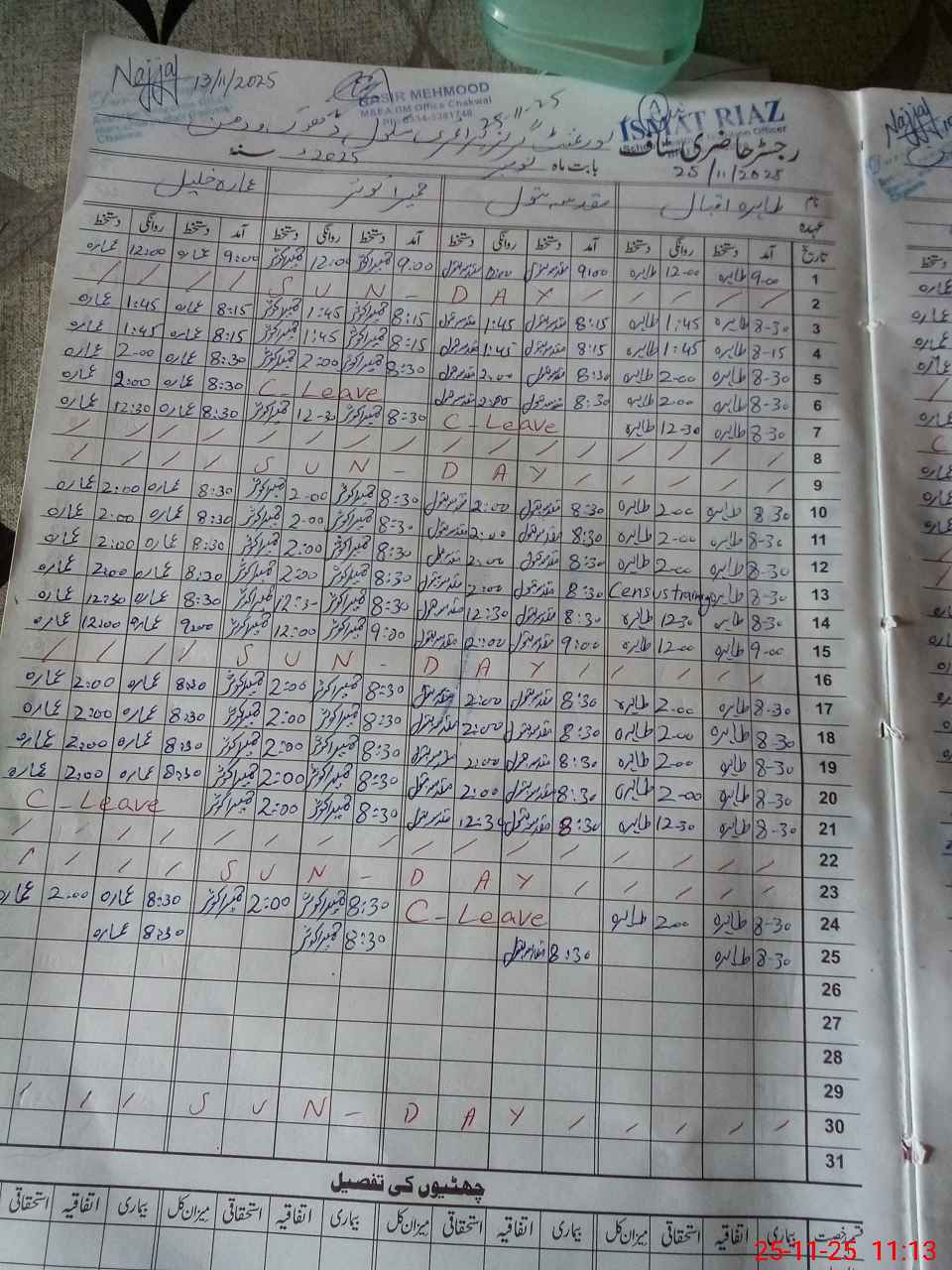 | CNIC | Full Name | Designation | R/C | Absence during last cal. month |