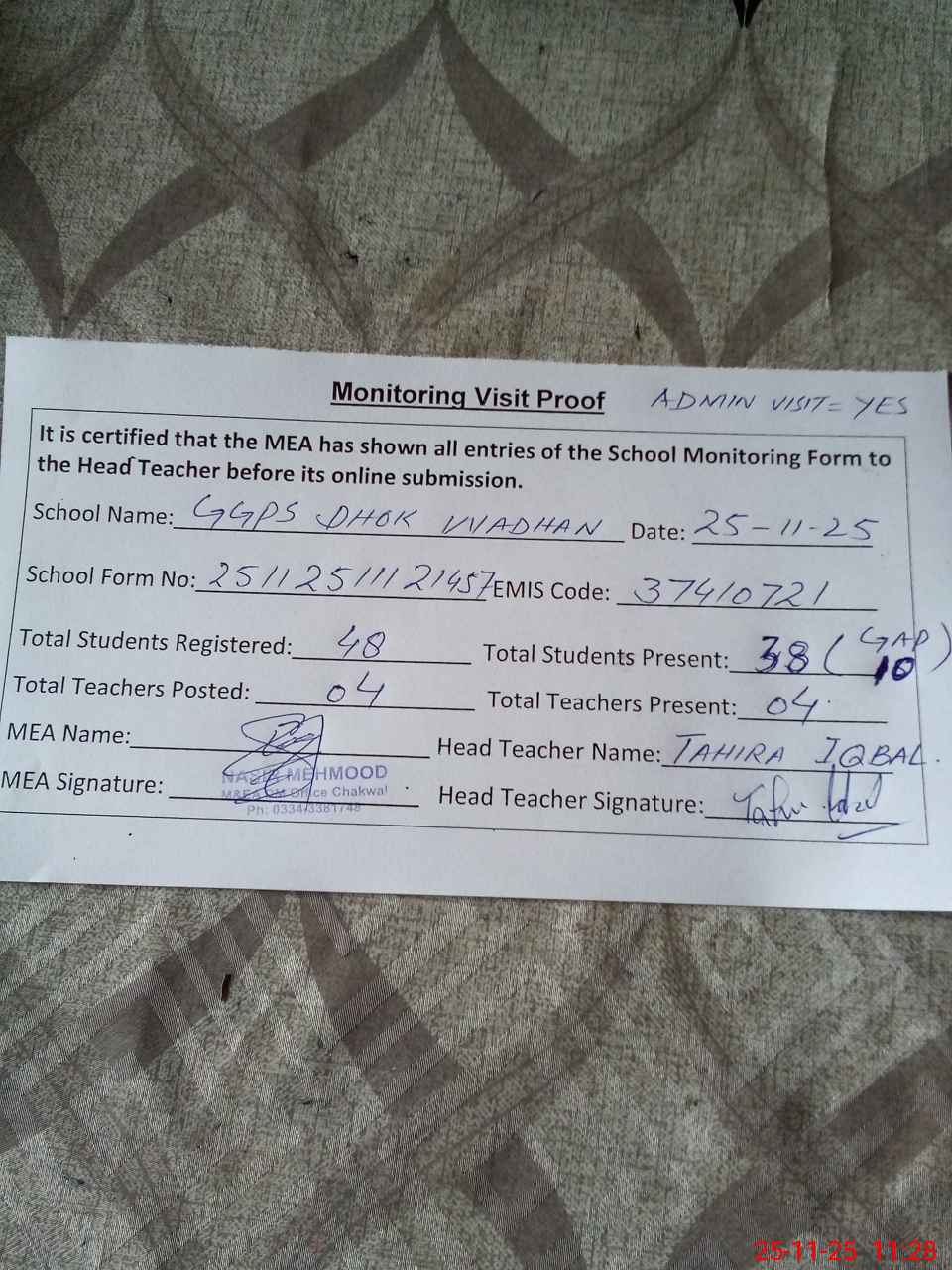 | Attendance Register | Head Teacher | MEA with School | Visit Proof |
