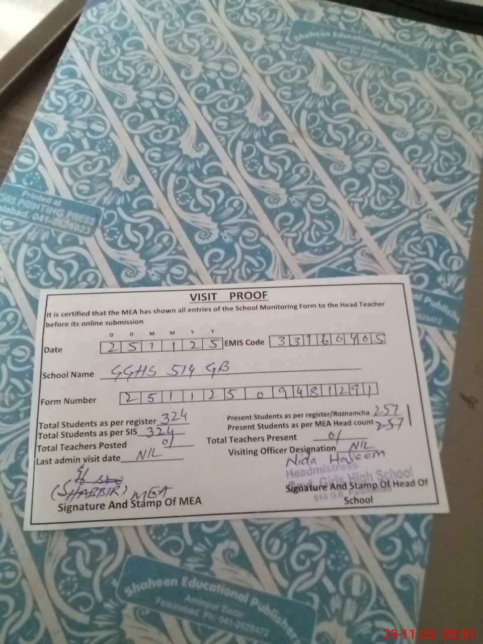 | Attendance Register | Head Teacher | MEA with School | Visit Proof |