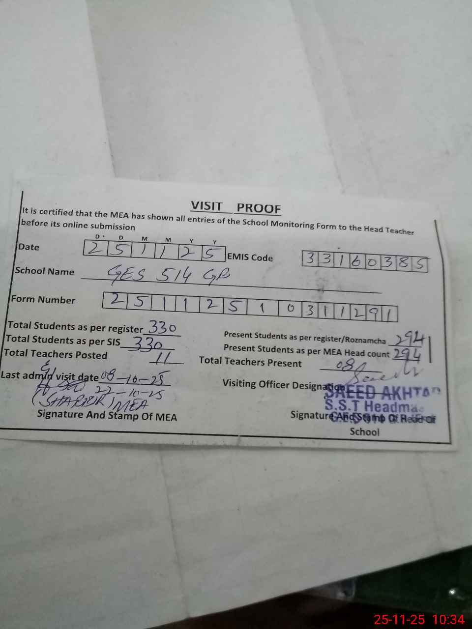 | Attendance Register | Head Teacher | MEA with School | Visit Proof |