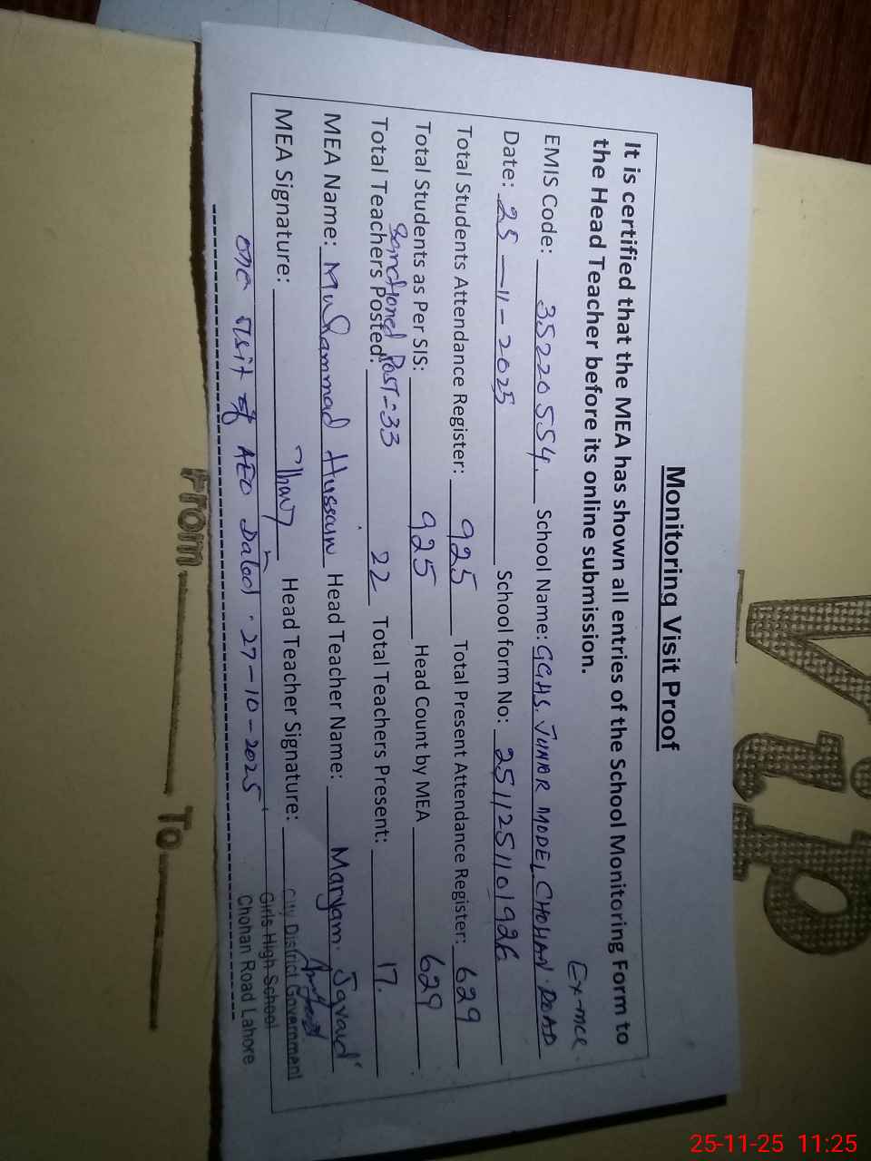 | Remarks (Use Separate Page if Required): 1 Class seven only one book received and 87 students in school 2 NSB data not up dated on SIS 3 One visit of AEO dated 27-10-2025 | |||||