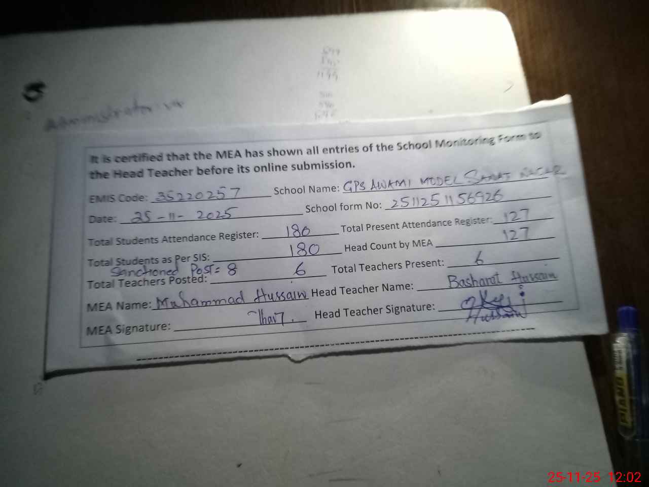 | Attendance Register | Head Teacher | MEA with School | Visit Proof |