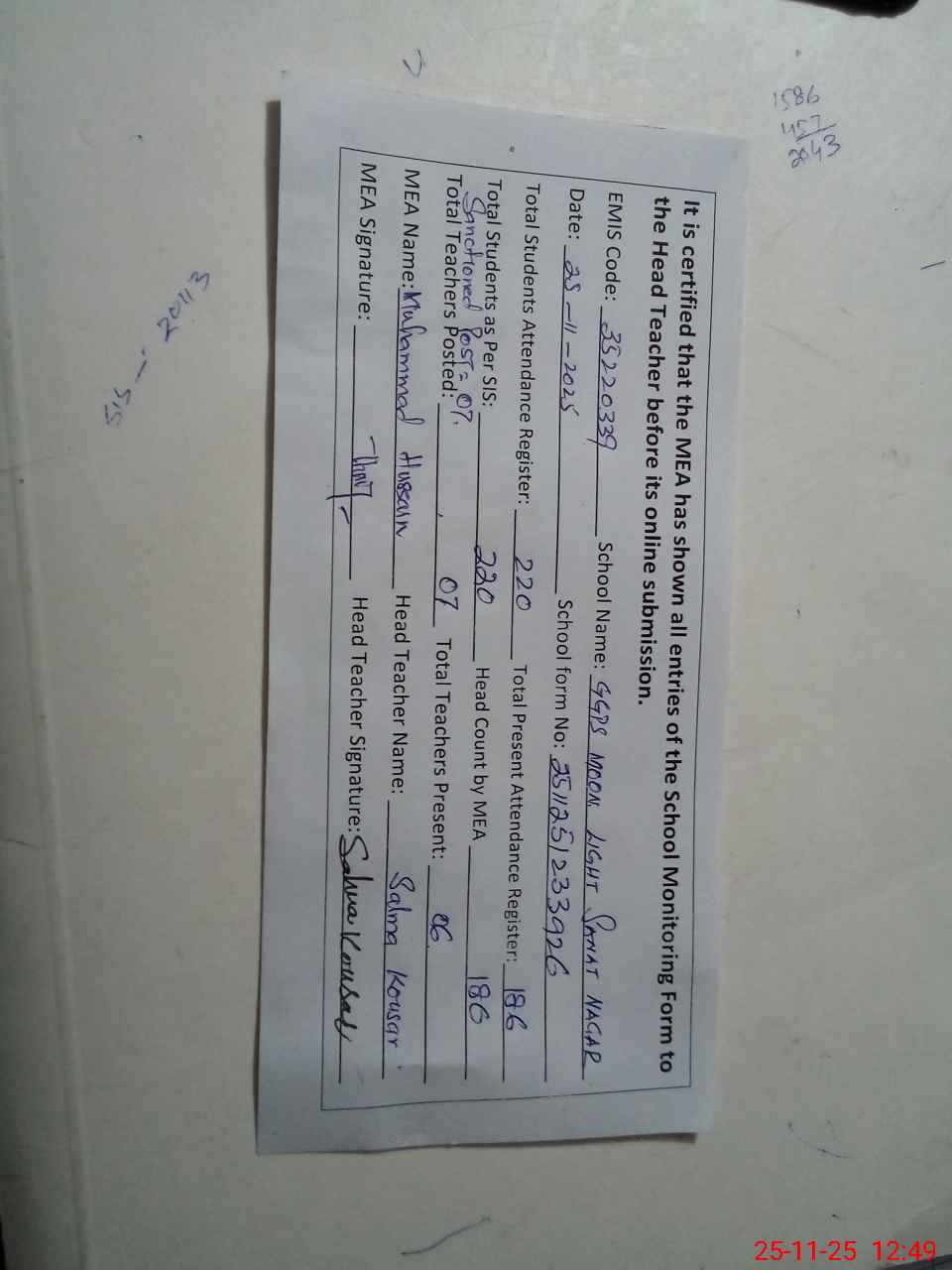 | Certified that this School was Inspected by the Undersigned MEA/DMO Today and the Information Stated Above is as Per Record. | |||||