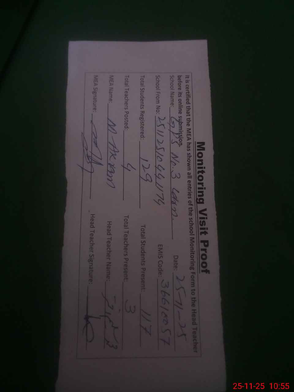 | Attendance Register | Head Teacher | MEA with School | Visit Proof |