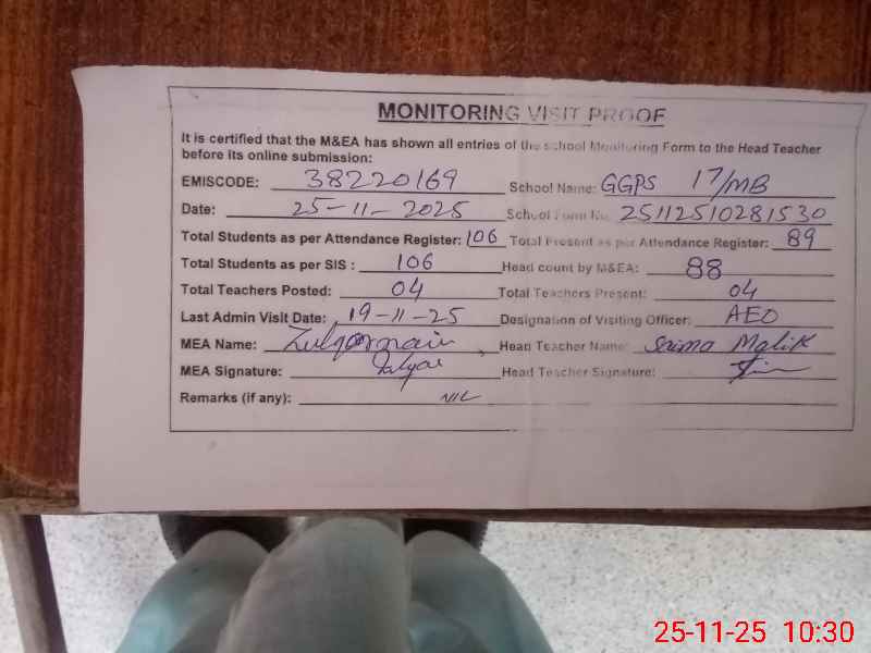 | EMIS Code: 38220169 | Name of School: GGPS CHAK NO 17 MB | |||