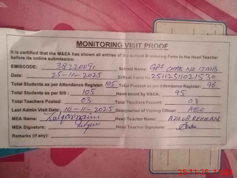 | EMIS Code: 38220091 | Name of School: GPS CHAK NO. 17/MB | |||
