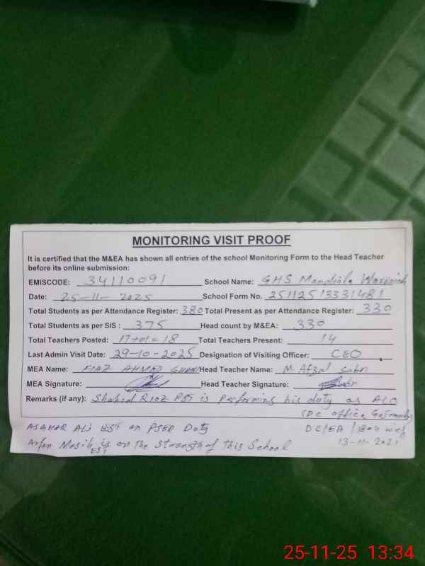 | EMIS Code: 34110091 | Name of School: GHS MANDIALA WARRIACH | |||