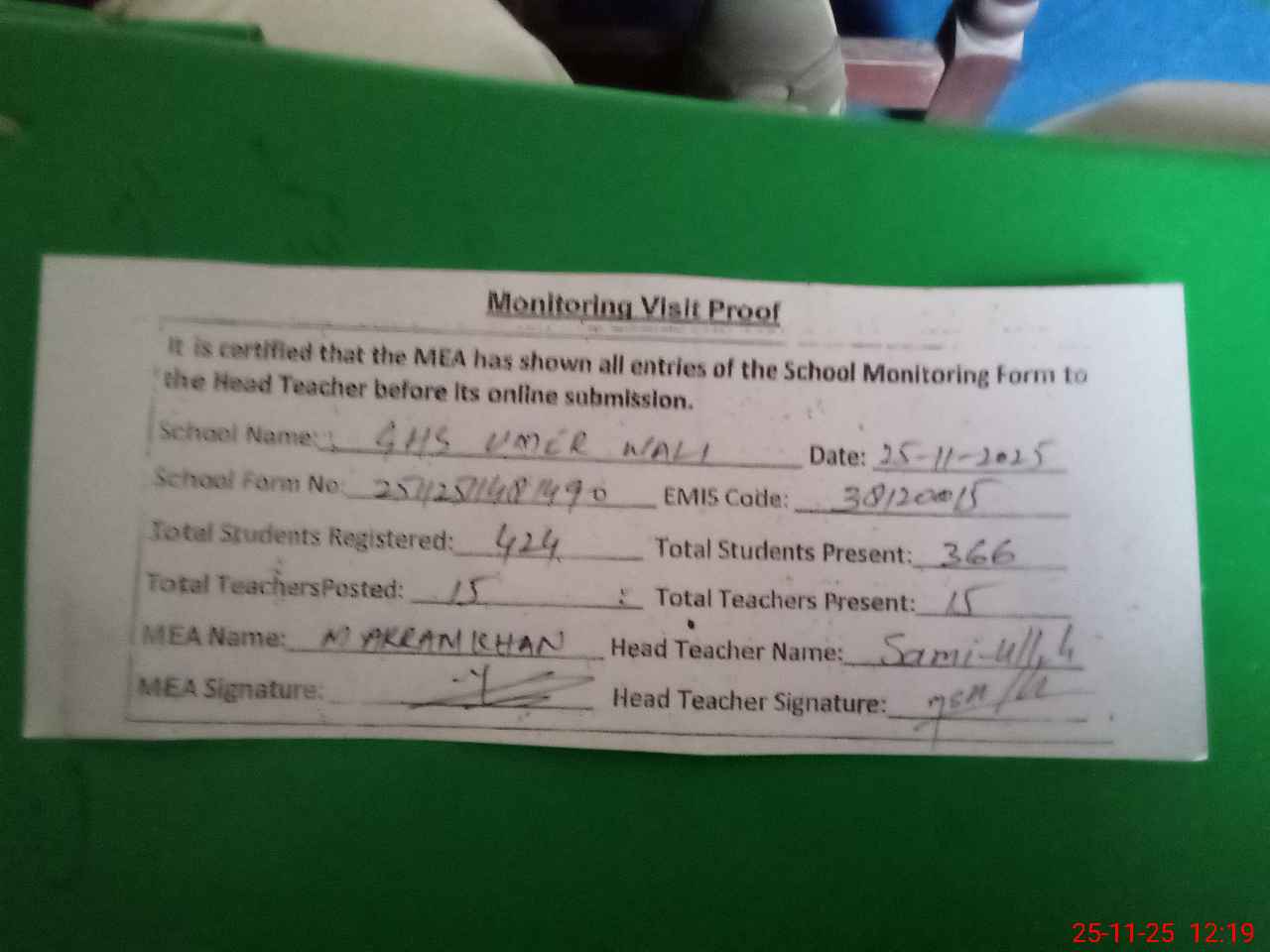 | EMIS Code: 38120015 | Name of School: GHS UMAR WALI | |||