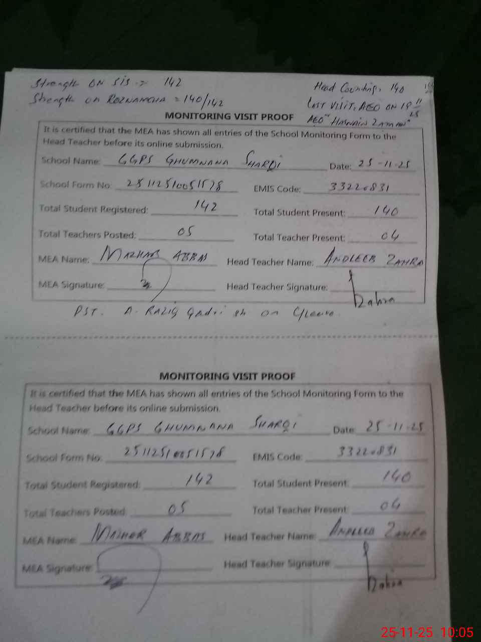 | Attendance Register | Head Teacher | MEA with School | Visit Proof |