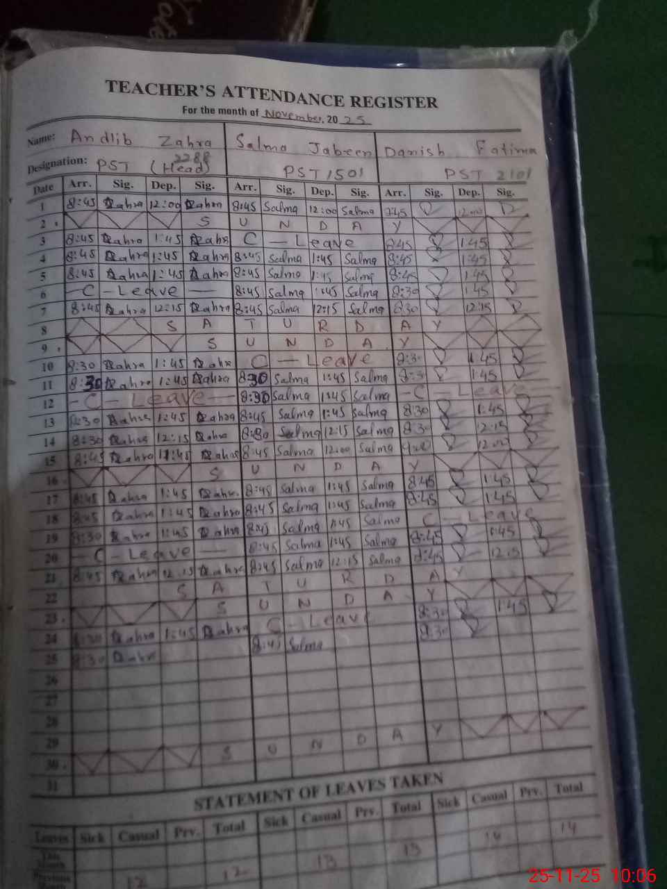 | CNIC | Full Name | Designation | R/C | Absence During Last Calender Month |