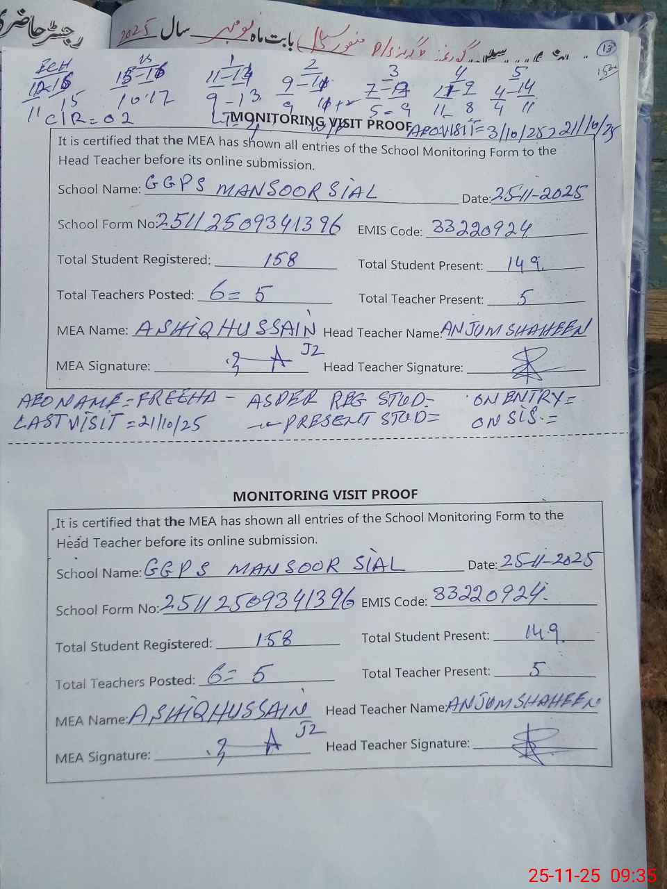 | EMIS Code: 33220924 | Name of School: GGPS MANSOOR SIAL | |||
