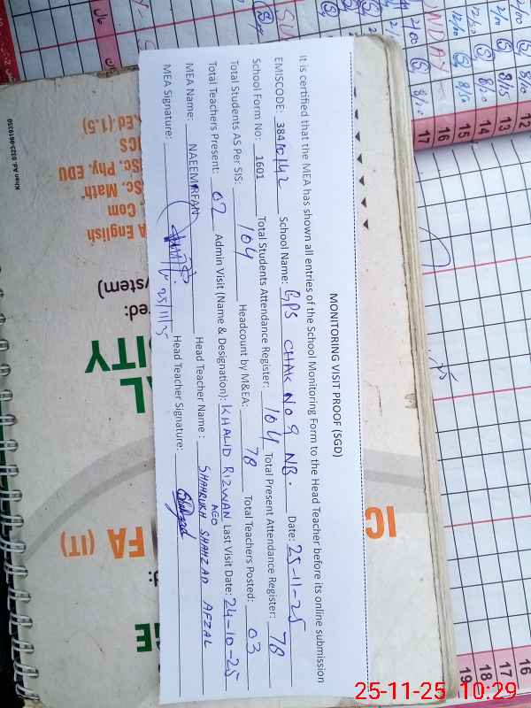 | Total no. of Classrooms: 5 No. of Classrooms Used for Teaching: 4 No. of Classrooms Storing Old Furniture, FTBs, etc: 0Comments if Any: Visit the school on 25 November 2025 PST Zafar Iqbal mentioned leave on attendance register but not provided any valid documents. Daily rooznamcha not maintained |