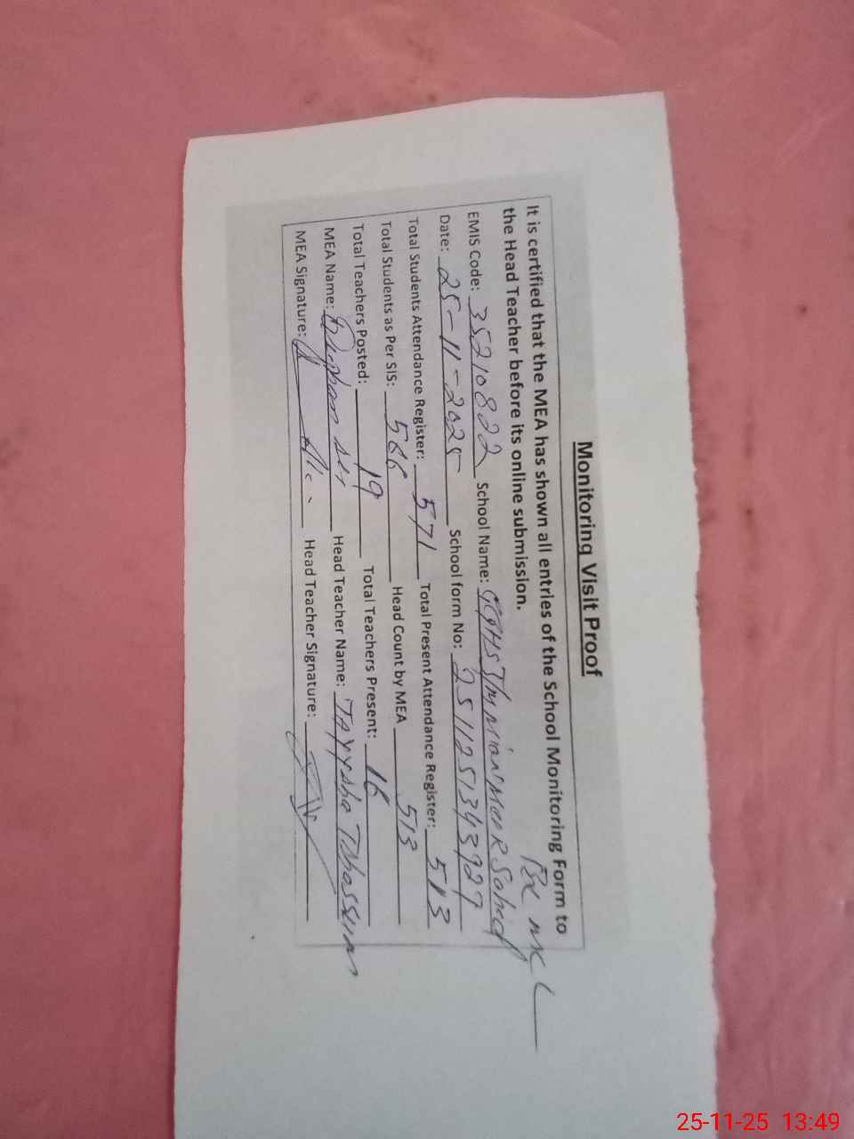 | Attendance Register | Head Teacher | MEA with School | Visit Proof |