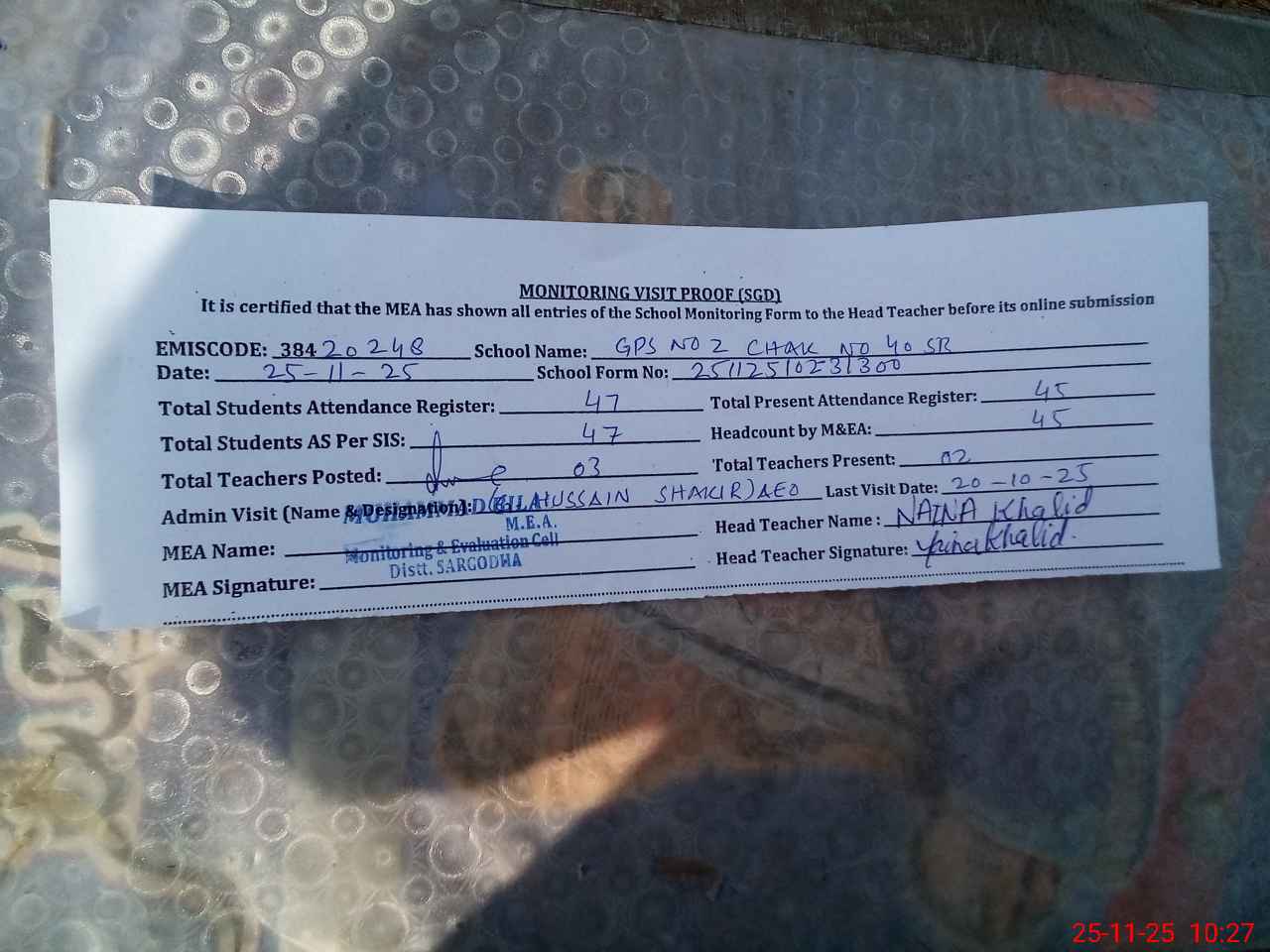 | Attendance Register | Head Teacher | MEA with School | Visit Proof |