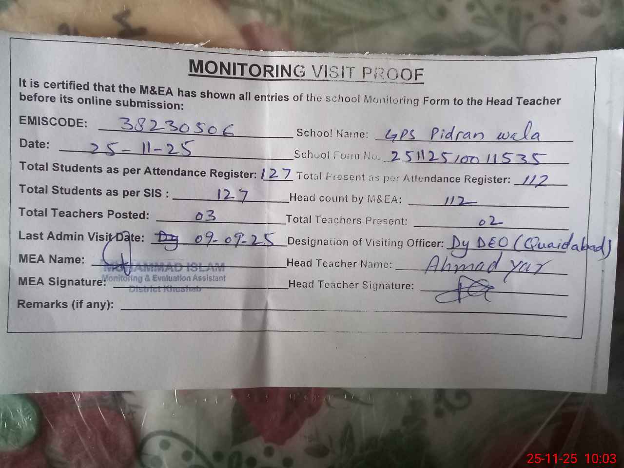 | Remarks (Use Separate Page if Required): Dy DEO visited school on 9 September 2025 Students strength on sis 127 | |||||