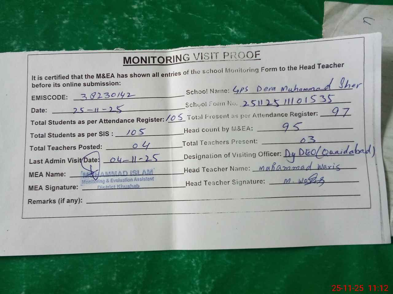 | Remarks (Use Separate Page if Required): Dy DEO visited school on 4 November 2025 Students strength on sis 105 | |||||