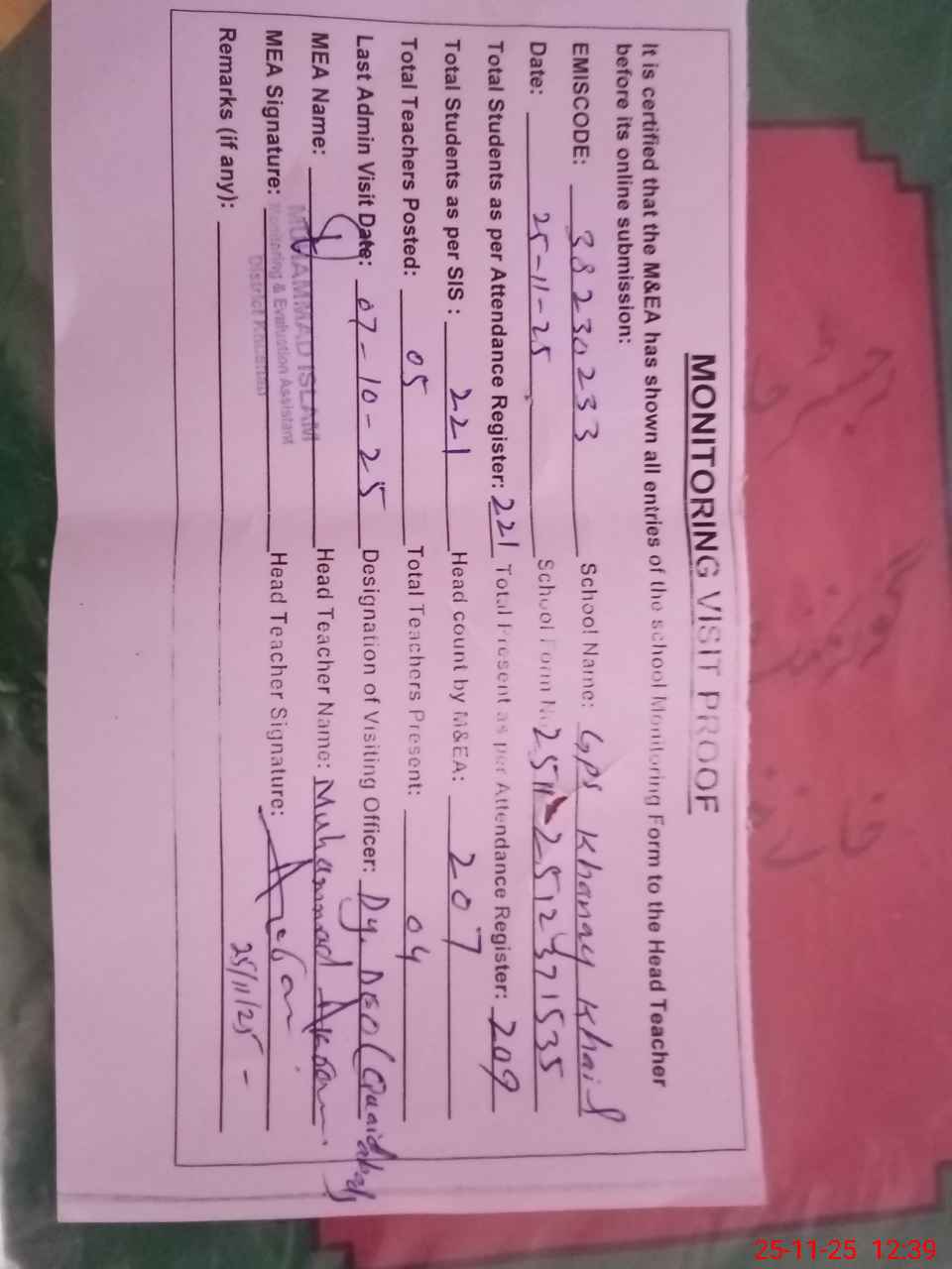 | Remarks (Use Separate Page if Required): Dy DEO visited school on 7 October 2025 Students strength on sis 221 | |||||