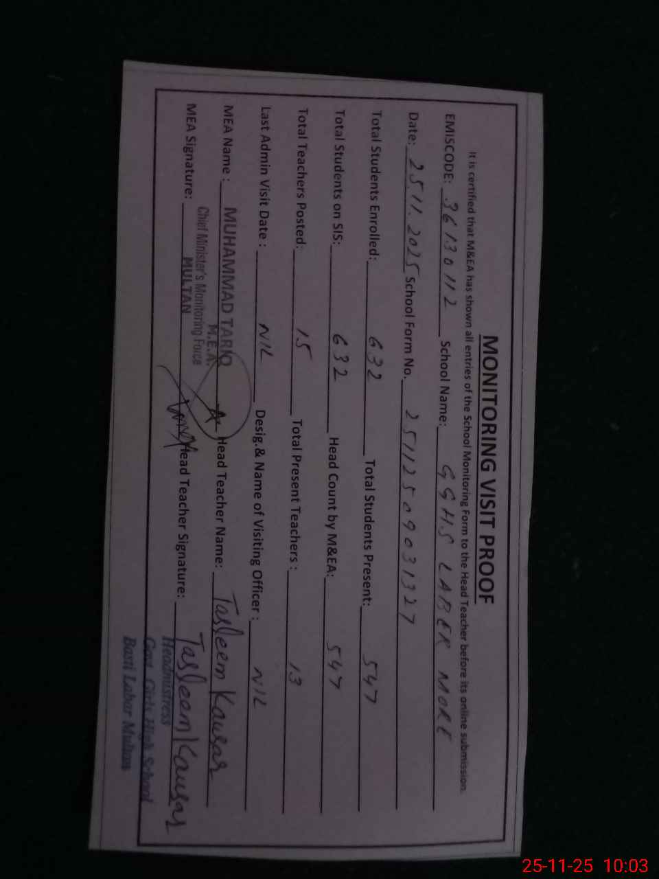 | EMIS Code: 36130112 | Name of School: GGHS LABER MORE MULTAN | |||