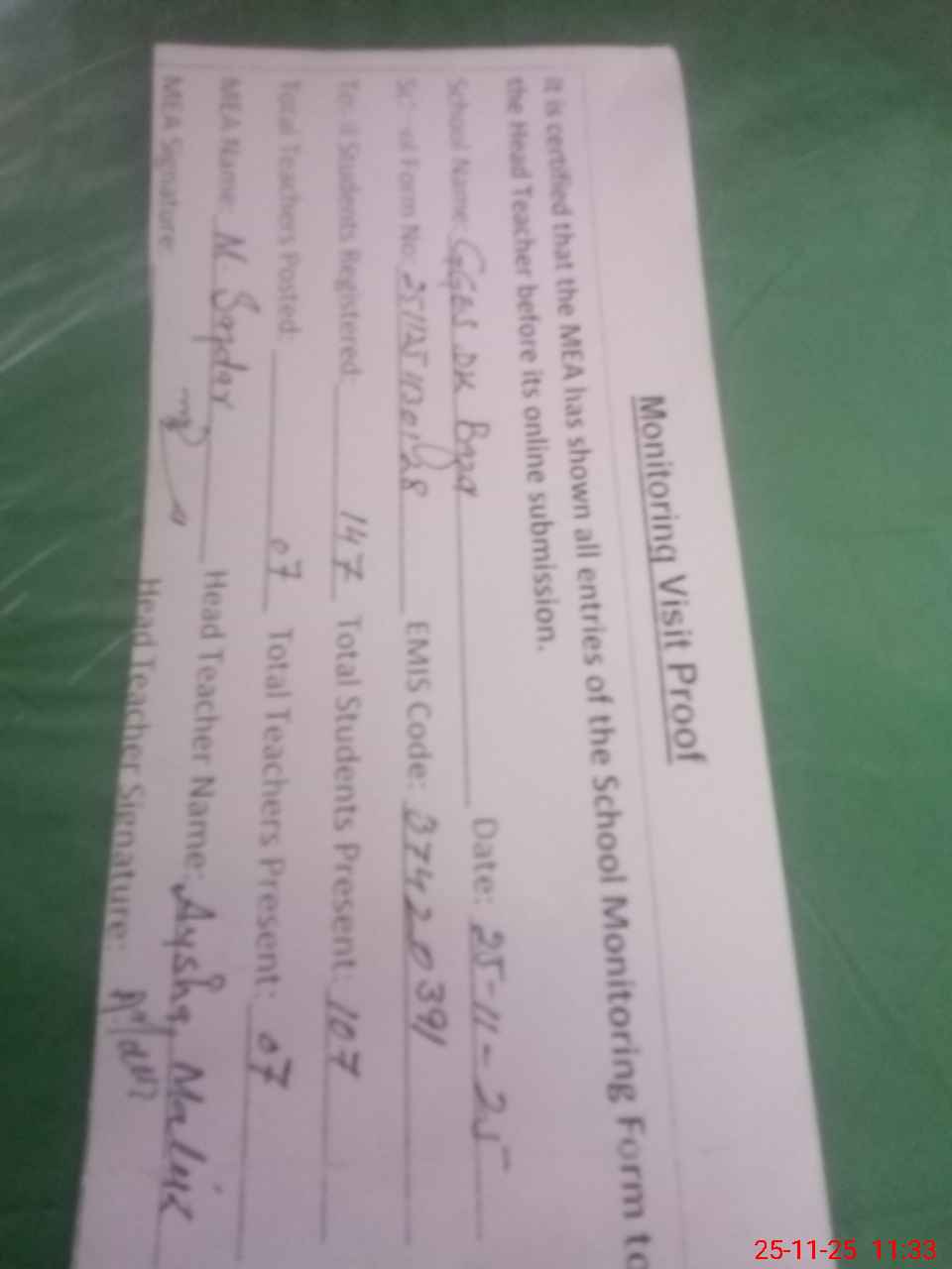 | Attendance Register | Head Teacher | MEA with School | Visit Proof |