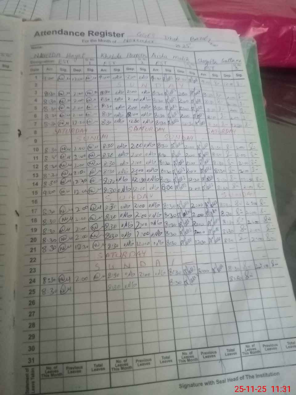 | CNIC | Full Name | Designation | R/C | Absence During Last Calender Month |